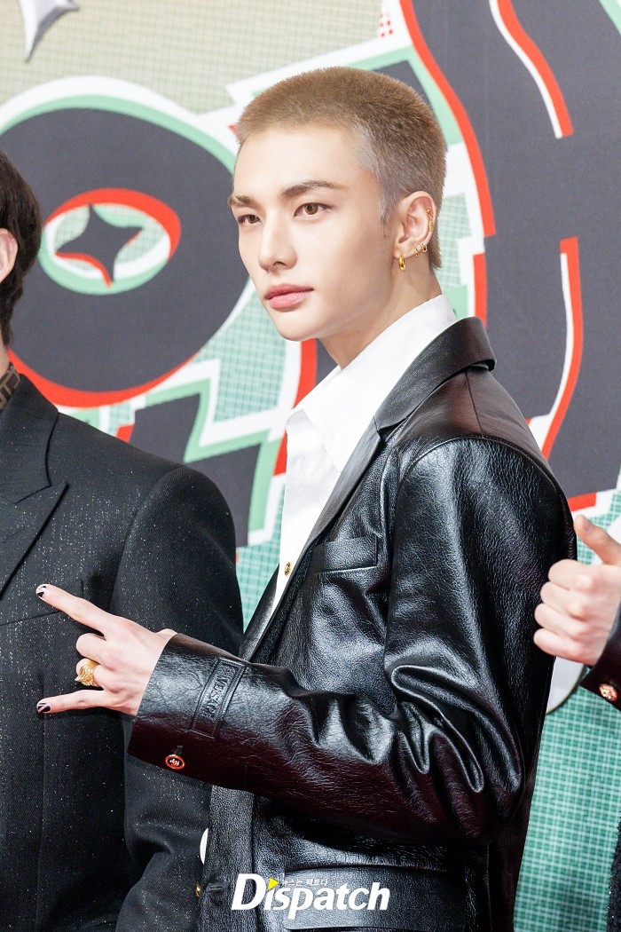 '스트레이 키즈' 현진은 파격적인 삭발 헤어스타일로 시선을 사로잡았다.