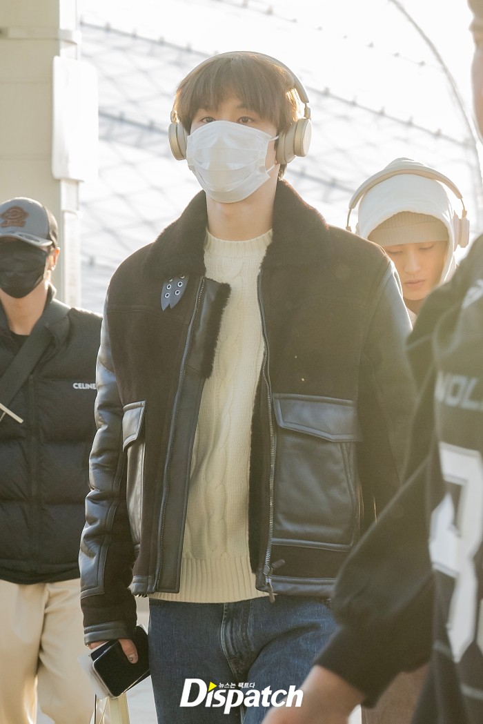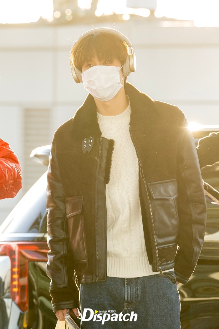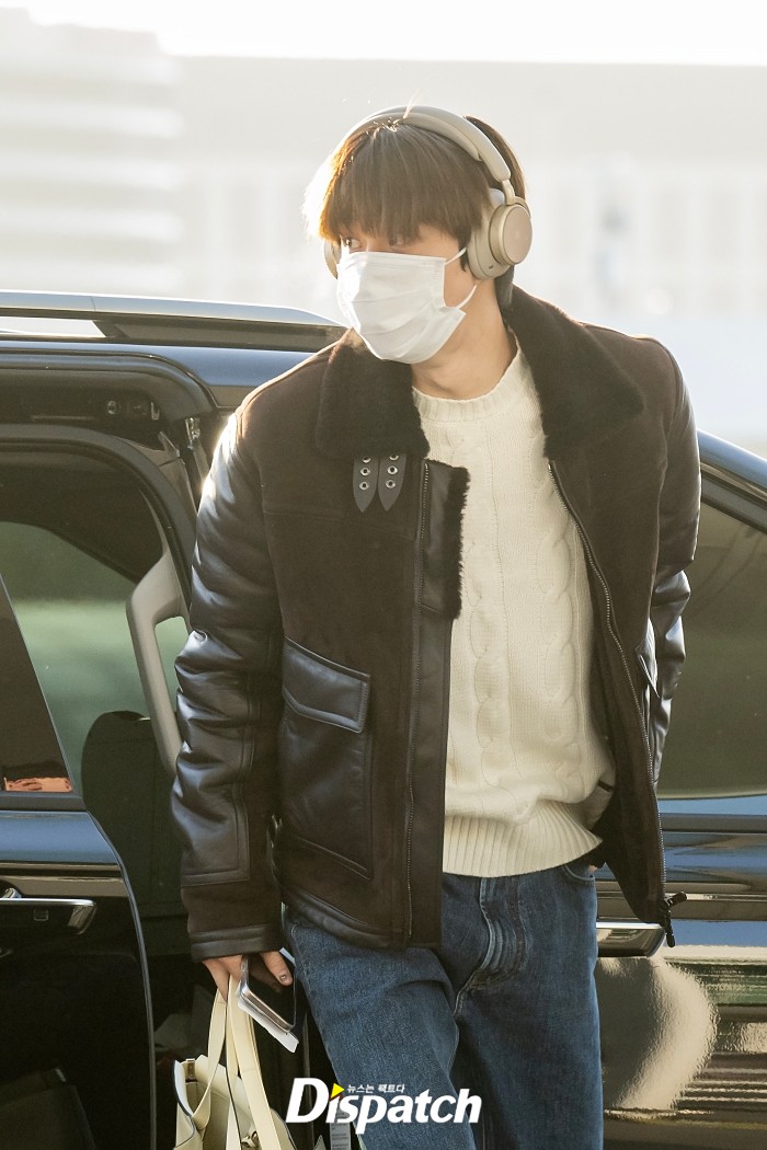정우는 블랙 무스탕 재킷으로 공항패션을 완성했다. 잘생긴 비주얼이 돋보였다.