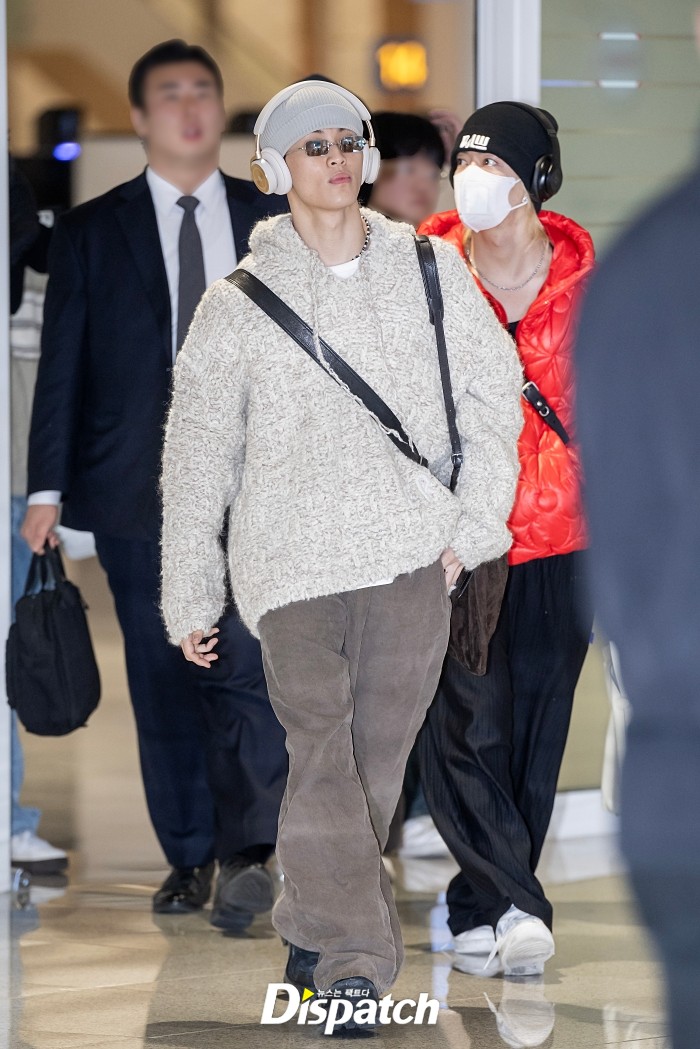 마크는 톤온톤룩으로 공항패션을 완성했다. 헤드셋과 선글라스로 힙한 매력을 더했다.