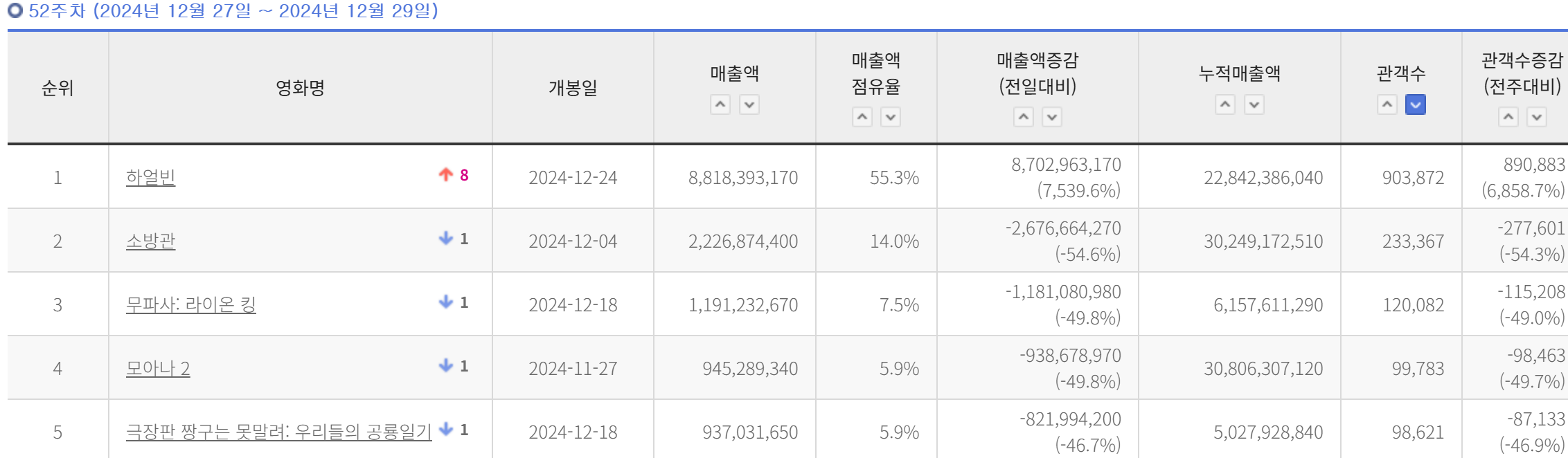 3위는 '무파사: 라이온 킹'(12만여 명)이다. 4위는 '모아나 2'(9만 9천여 명), 5위는 '극장판 짱구는 못말려: 우리들의 공룡일기'(9만 8천여 명) 등이 뒤를 이었다.