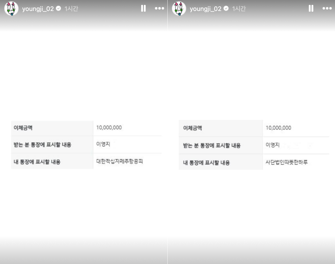 이영지는 3일 인스타그램을 통해 대한적십자제주항공과 사단법인따뜻한하루에 각각 1,000만 원을 기부한 명세를 인증했다.