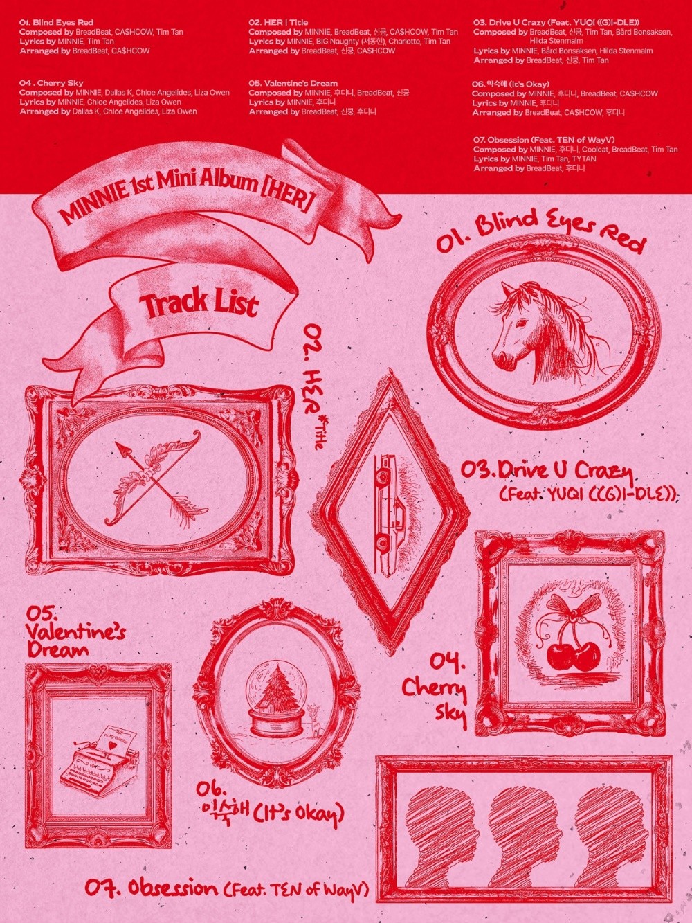 큐브엔터테인먼트는 10일 공식 SNS에 민니의 첫 번째 미니앨범 '허'(HER) 트랙리스트 이미지를 공개했다. 감각적인 콘셉트와 음악을 예고했다.