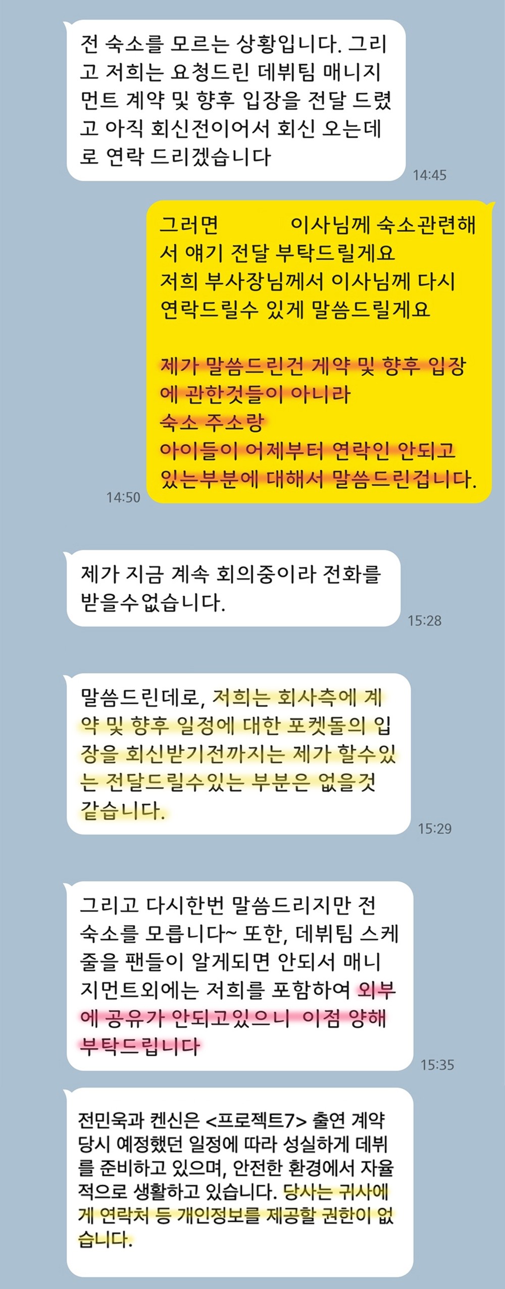 마지막으로 "(프로젝트7이) 활동 병행이 가능하다고 출연을 유도했으면서, 데뷔조 선정되자 활동 병행은 불가능하다고 말을 바꿨다"며 "이런 행태를 강력 규탄하며, 모든 법적 조치를 취하겠다"고 마무리했다.