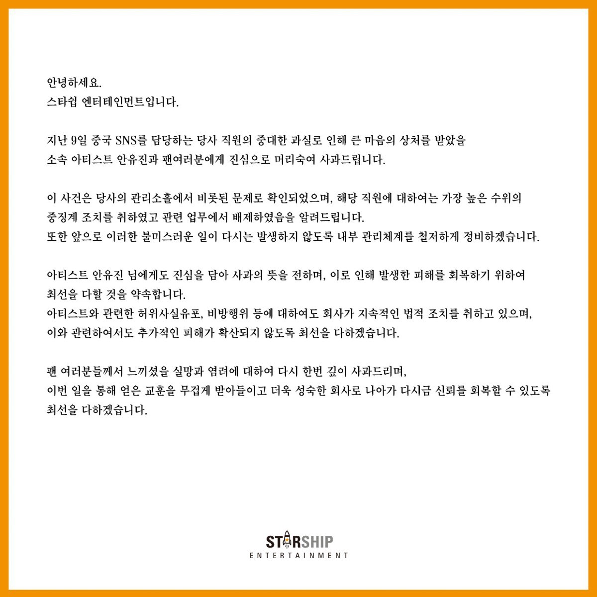 스타쉽은 15일 "중국 SNS를 담당하는 당사 직원의 중대한 과실이 있었다"며 "큰 마음의 상처를 받았을 안유진과 팬 여러분에게 진심으로 머리숙여 사과드린다"고 밝혔다.