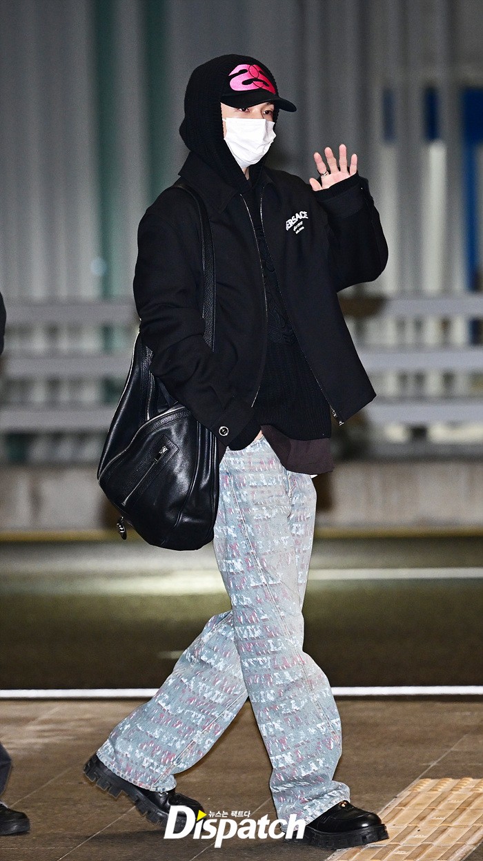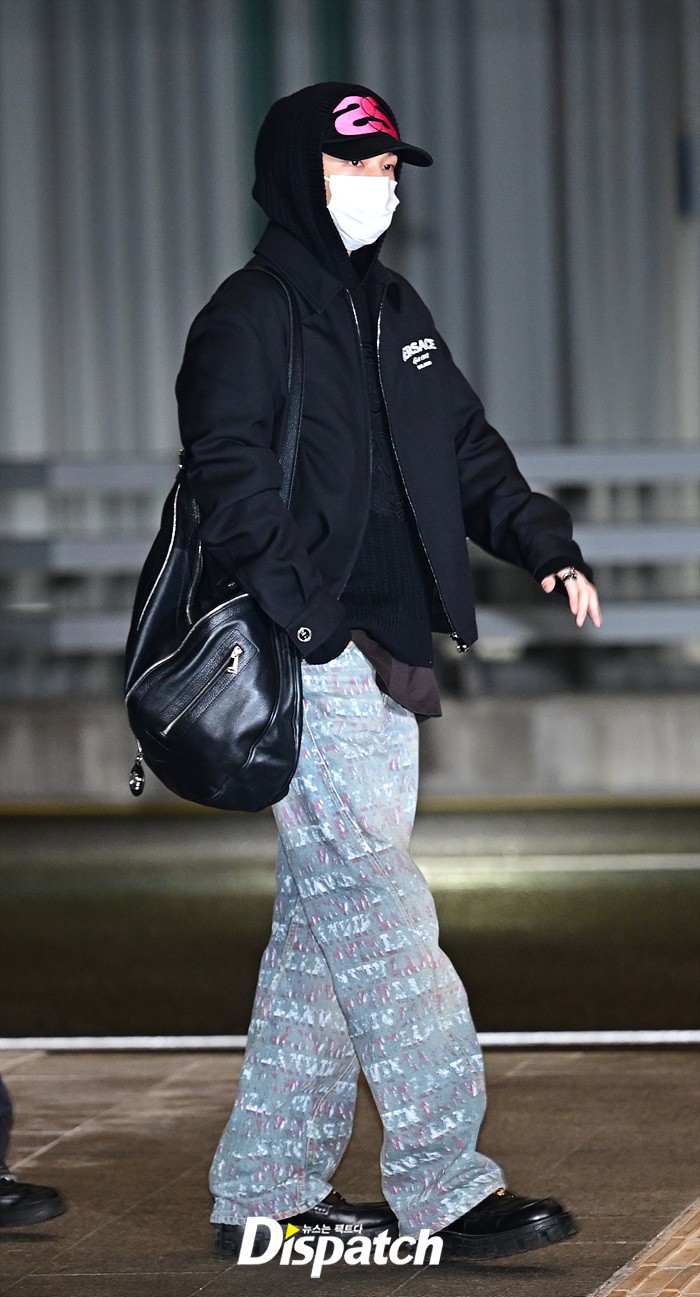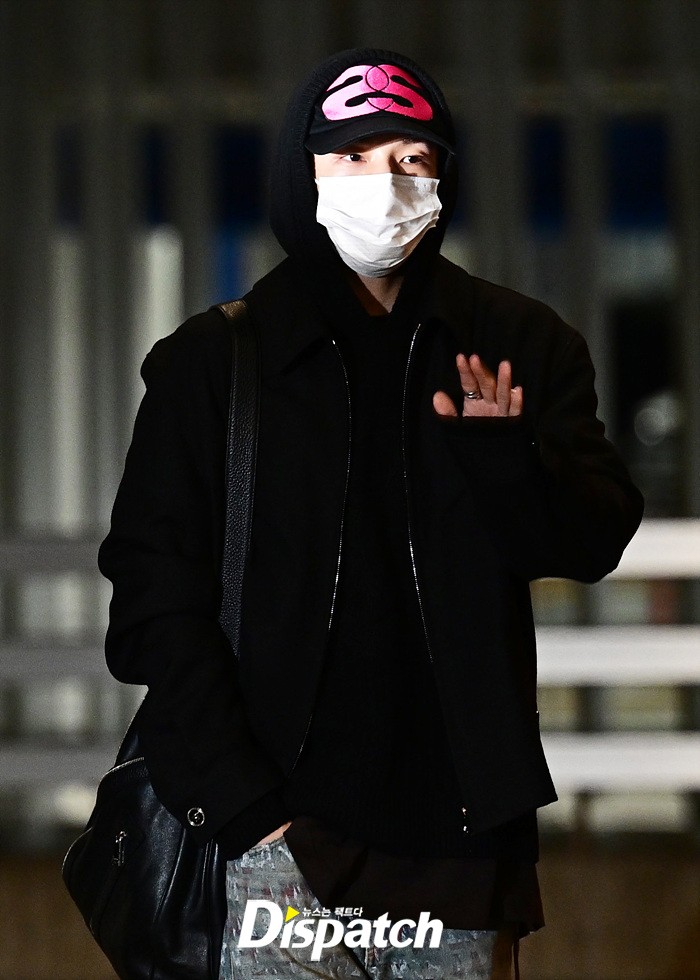 현진은 블랙 후드집업과 데님진으로 캐주얼한 공항패션을 연출했다. 모자와 마스크에도 훈훈한 비주얼이 돋보였다.