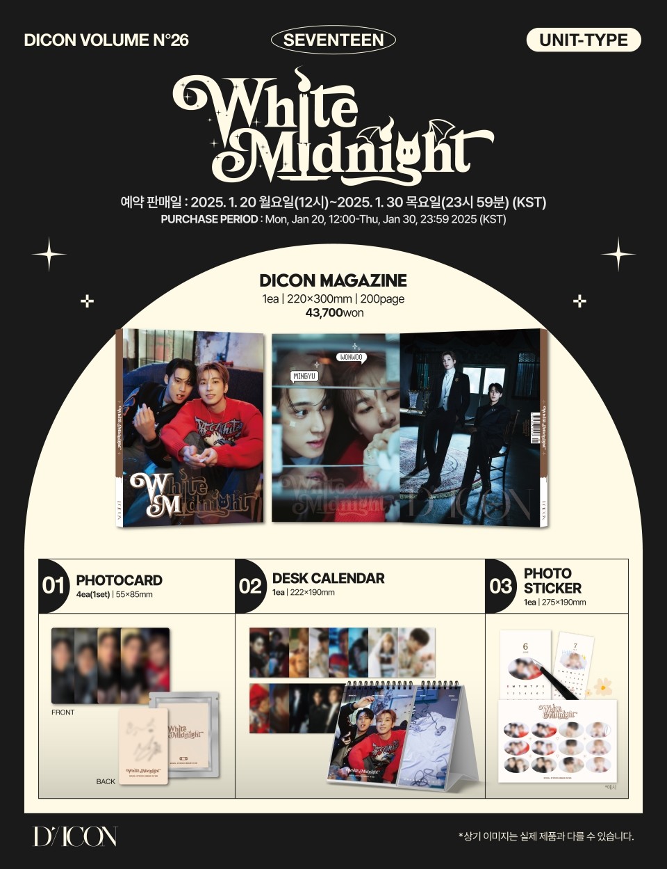 '디아이콘' 유닛 타입을 선택하면, 원우와 민규의 투샷을 별도로 제공한다. 포토카드 1세트(4ea), 탁상 달력(1ea), 포토 스티커(1ea) 등이 포함된다.