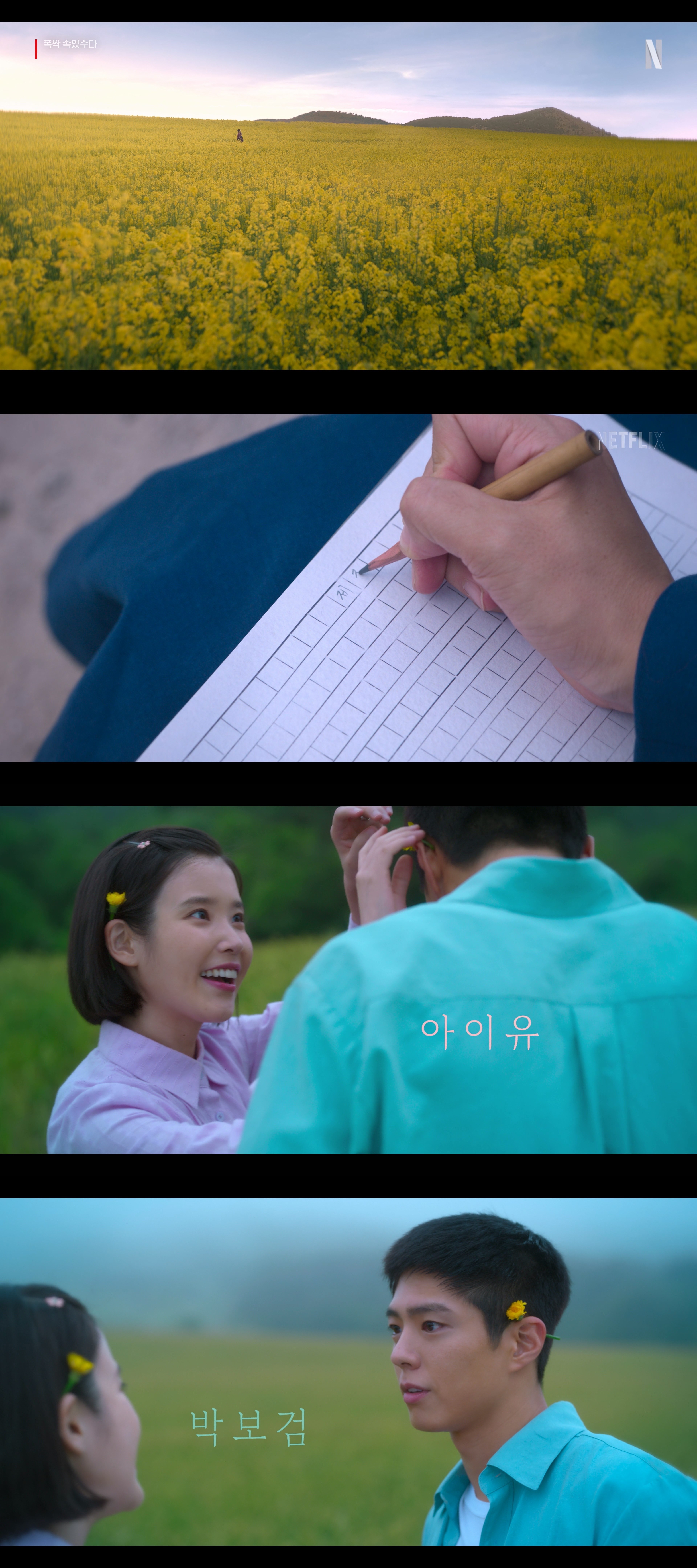 먼저, 포스터에는 4계절 중 봄이 담겼다. 애순(아이유 분)과 관식(박보검 분)이 유채꽃밭을 배경으로 서 있었다. 손을 잡은 채 미소 지었다.