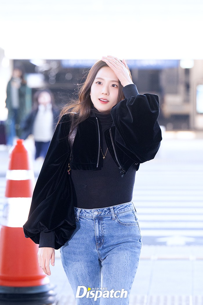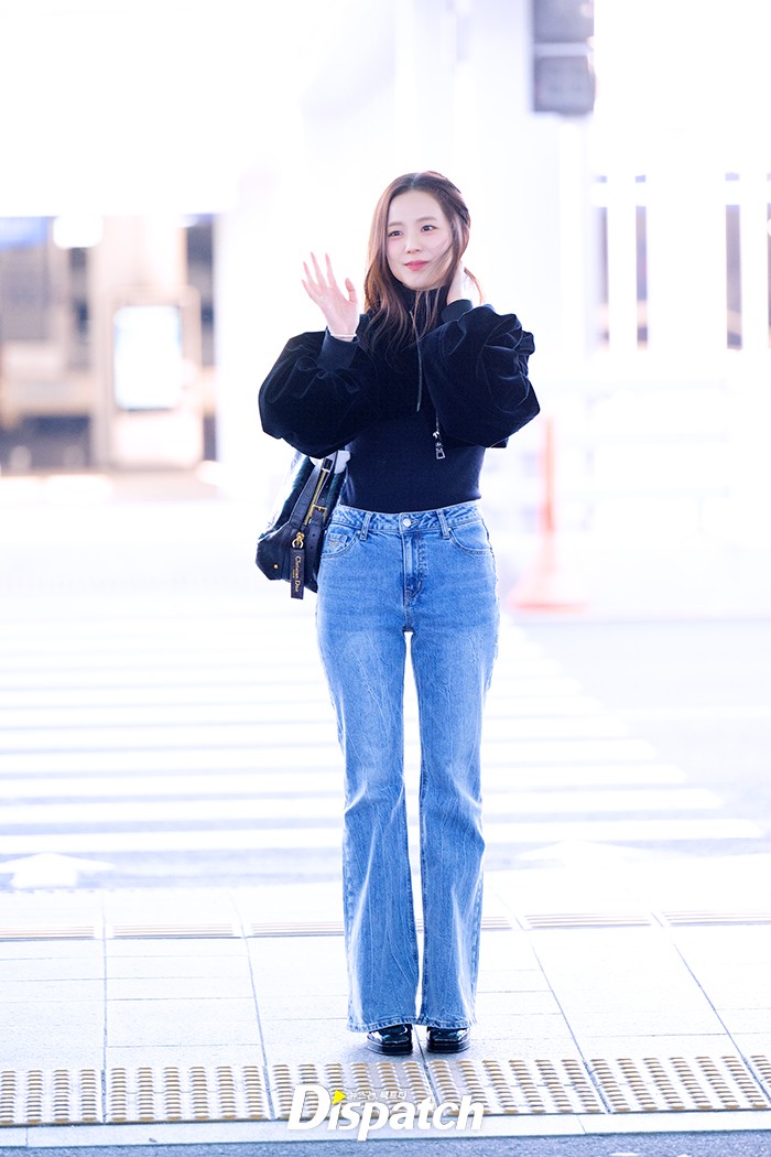 지수는 데님 팬츠에 블랙 재킷으로 시크한 공항패션을 연출했다. 인형같은 미모가 돋보였다.