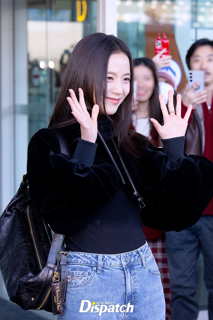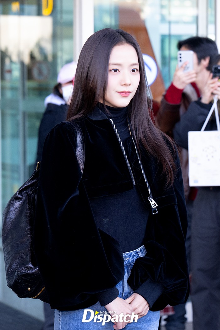 지수는 데님 팬츠에 블랙 재킷으로 시크한 공항패션을 연출했다. 인형같은 미모가 돋보였다.