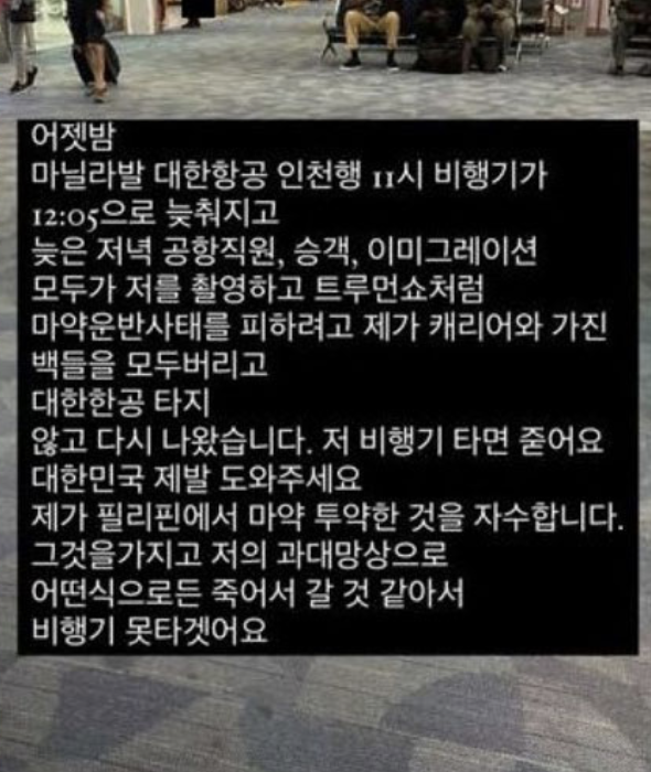 김나정은 필리핀에서 강제로 마약 흡입을 당했다고 주장했다. 필리핀에서 만난 젊은 사업가가 손을 묶고, 안대를 씌운 뒤 강제로 마약류 연기를 흡입하게 했다는 것.
