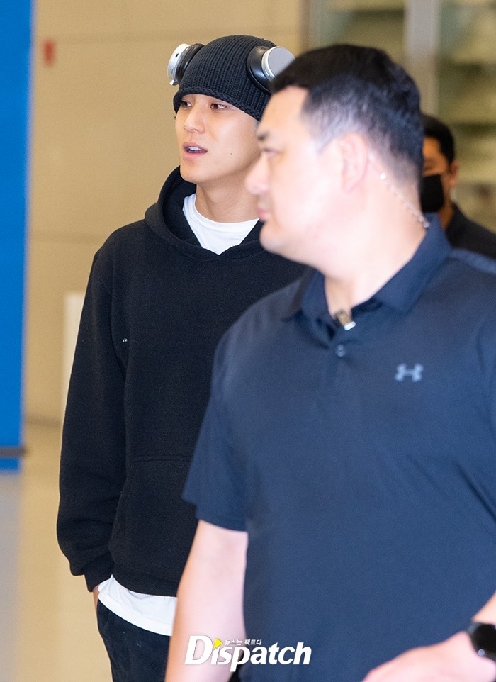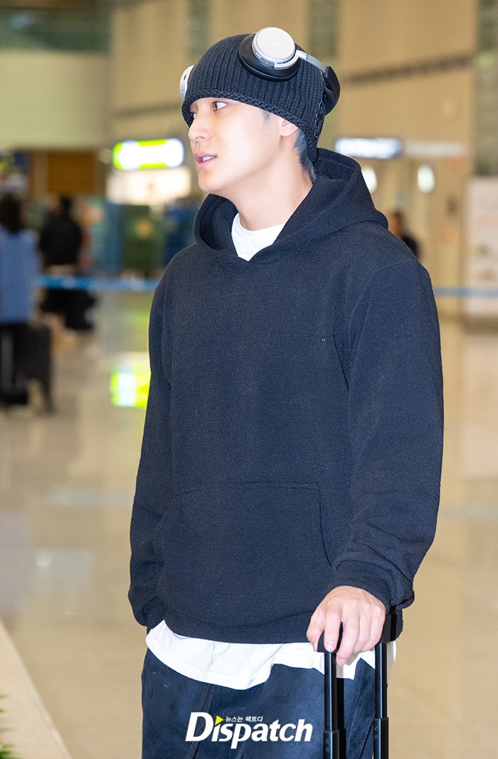 민규는 블랙 후디에 블랙 팬츠로 편한 입국 패션을 보여줬다. 여유로운 표정으로 입국장을 나섰다.