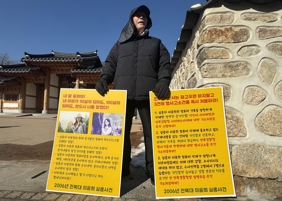 실종 딸 찾는 이동세씨(전주=연합뉴스) 이동세씨가 윤희씨를 찾는 전단지를 가득 붙이고 전북대와 전주지검을 오가며 딸의 실종 사건 재수사를 촉구하고 있다. 2007.1.7 [연합뉴스 자료사진. 재판매 및 DB 금지]