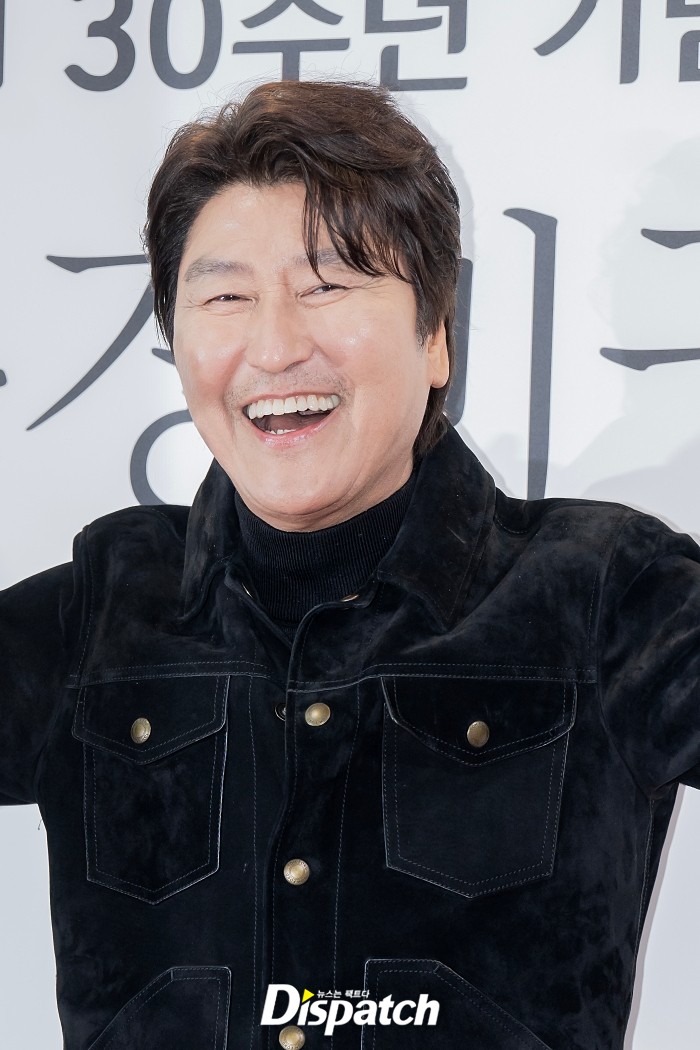 송강호는 올블랙룩으로 멋을 냈다. 머리 위로 크게 하트포즈를 취하며 영화팬들의 환호에 화답했다.