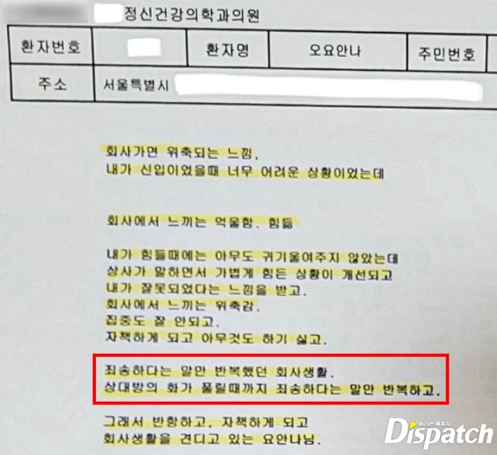 '디스패치'는 오요안나의 정신과 상담 기록을 입수했다. '회사 가면 위축되는 느낌', '회사에서 느끼는 억울함', '죄송하다는 말만 반복하는 회사 생활' 등이 적혀 있었다.