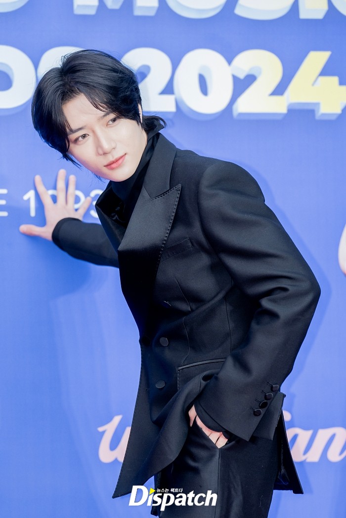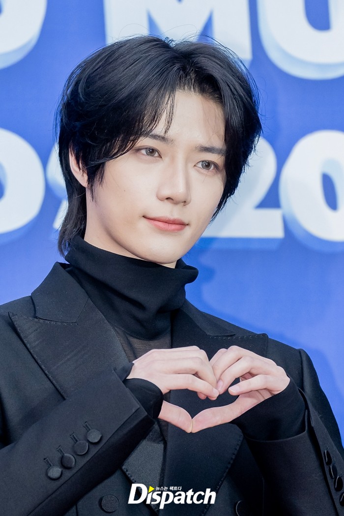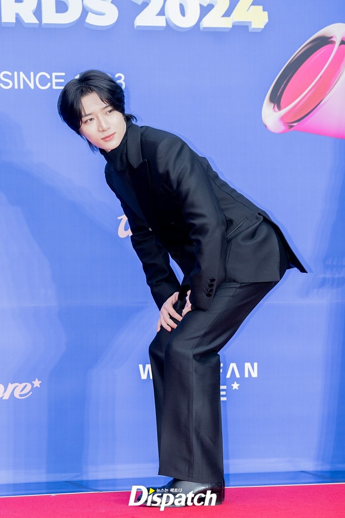'투모로우바이투게더'는 블랙 수트로 남성미를 드러냈다. 범규는 독특한 포즈로 플래쉬 세례를 받았다.