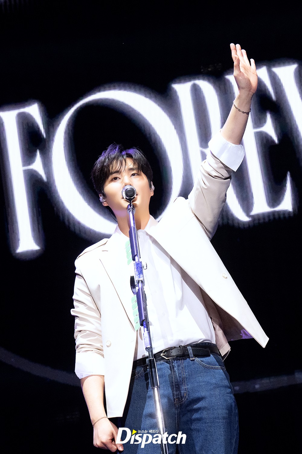 ’아이 러브드 유', '놓아 놓아 놓아', 데뷔곡 '콩그레츄레이션' 등을 부르며 추억을 되새겼다. 원필은 손을 귀에 대고 팬들의 목소리에 집중했다.