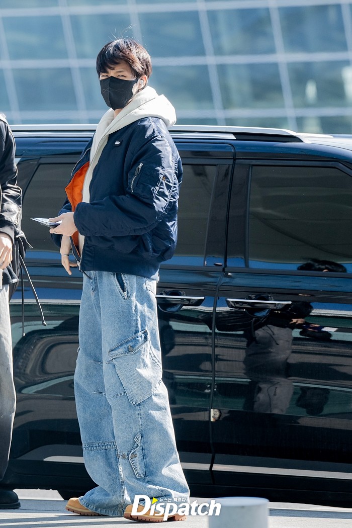 제노는 집업 후디와 점퍼, 데님 팬츠로 공항패션을 완성했다. 남다른 피지컬이 시선을 사로잡았다.