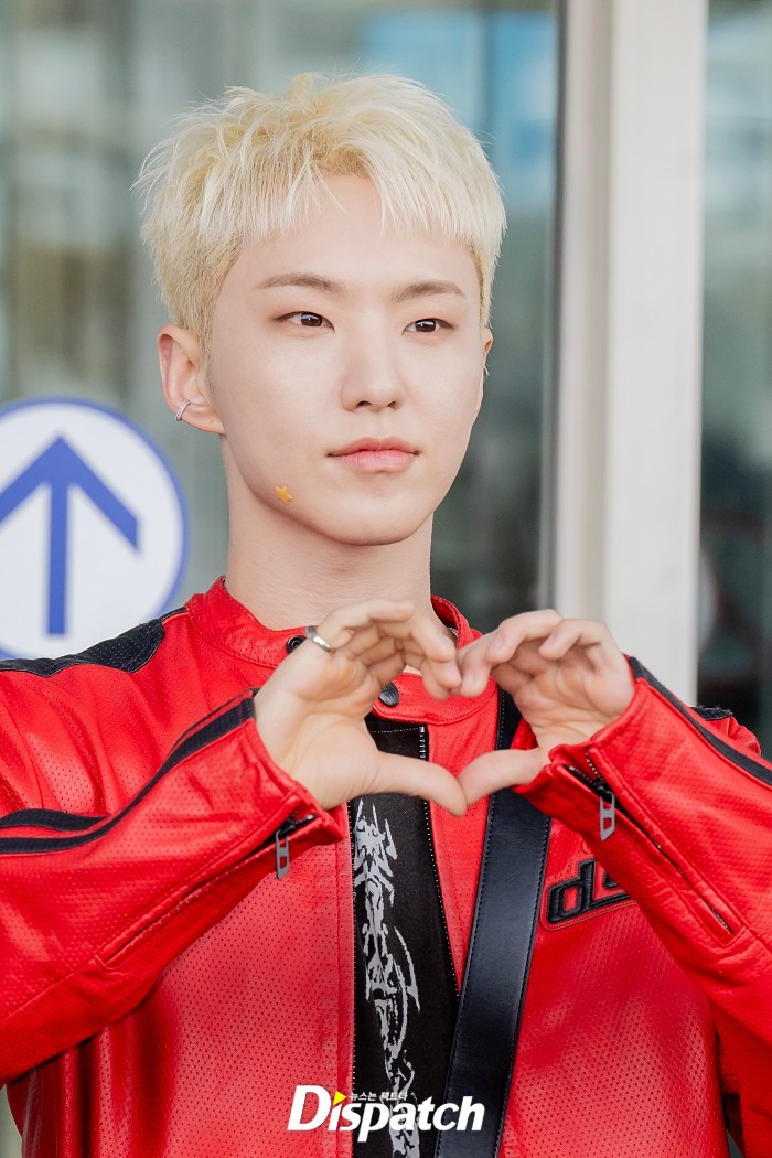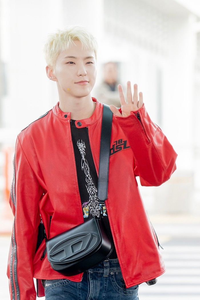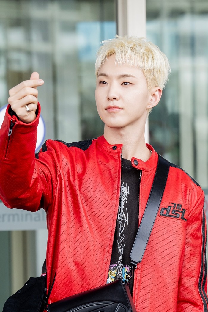 호시는 레더 재킷과 데님 팬츠로 멋을 냈다. 마중 온 팬들에게 환한 미소와 하트로 팬서비스를 펼쳤다.