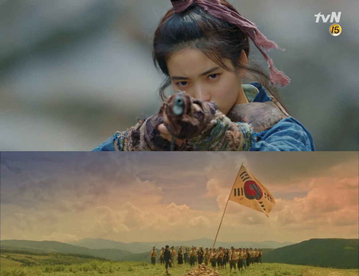 고애신(김태리 분) : "꼴은 이래도, 오백 년을 이어져 온 나라요. 그 오백 년 동안 호란, 왜란 많이도 겪었소. 그럴 때마다 누군가는 목숨을 걸고 지켜내지 않았겠소. 그런 조선이 평화롭게 찢어발겨지고 있소.
