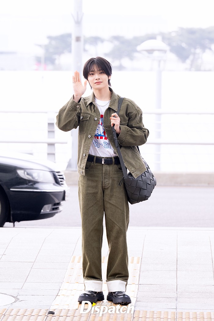 아이엔은 카키 컬러의 데님 셋업으로 댄디한 공항패션을 연출했다. 조각같은 비주얼이 돋보였다.