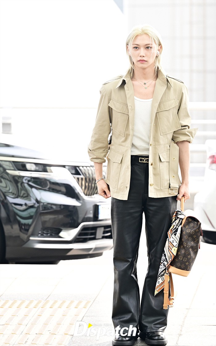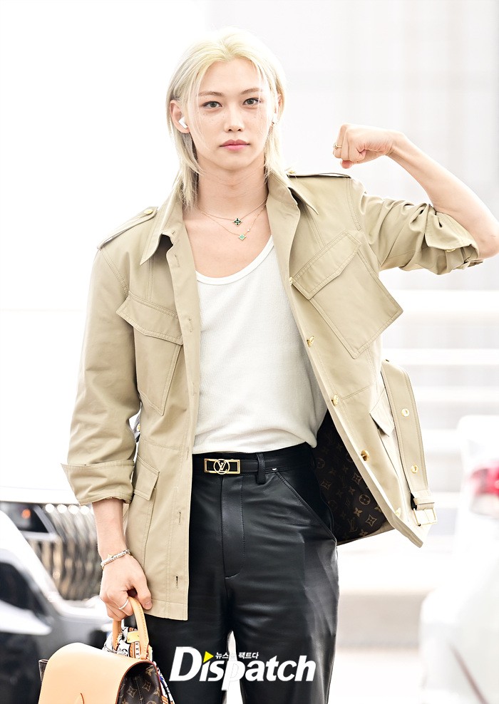 필릭스는 베이지 재킷과 가죽 팬츠로 남다른 패션감각을 뽐냈다. 눈부신 금발헤어와 비현실적인 비주얼이 시선을 사로 잡았다.