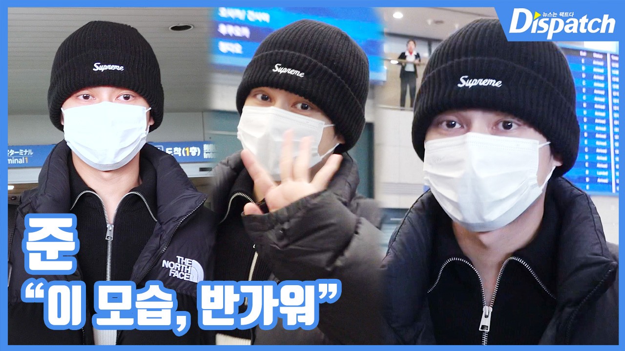 이날 준은 블랙 컬러의 비니와 패딩, 데님 진 등으로 더욱 훈훈하고 센스 있는 공항패션을 뽐냈다.