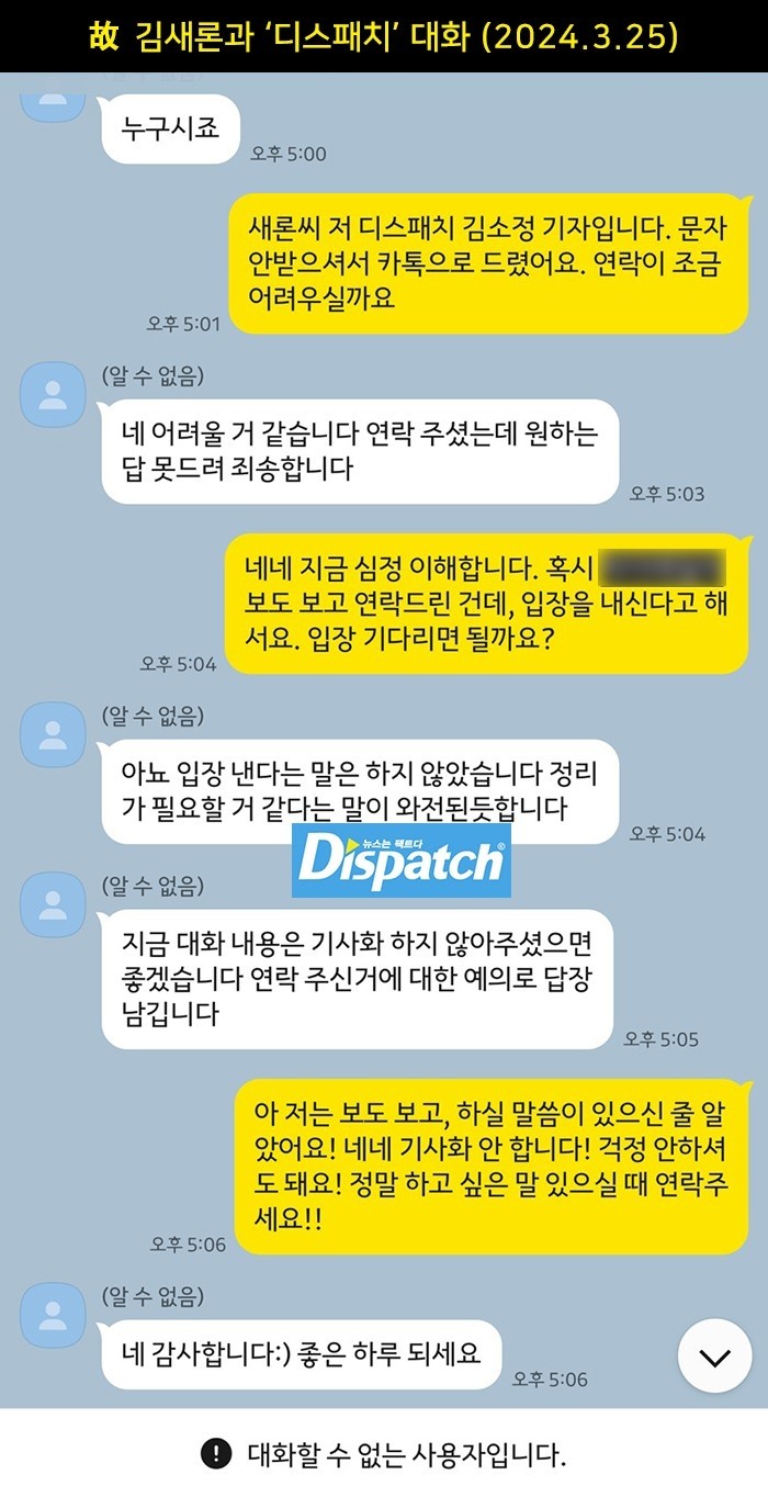 '디스패치'(이하 'D')는 김새론에게 문자를 보냈습니다. “김새론이 입장을 정리중이다“는 보도가 쏟아졌고, 직접 경위를 묻기 위해 연락을 시도했습니다.