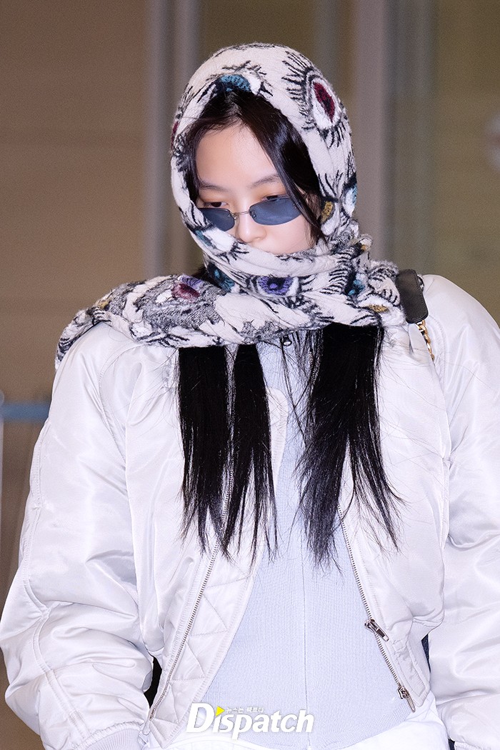 제니는 트레이닝 룩에 스카프를 매치해 수수한 공항패션을 연출했다. 시크한 비주얼이 돋보였다.