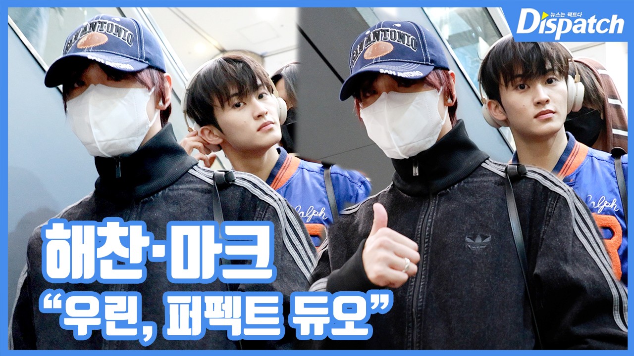 마크와 해찬은 입국길에 완벽한 투 샷을 보여주며 마크의 첫 솔로 앨범 수록곡 '+82 Pressin(Feat.해찬)' 무대를 기대하게 만들었다.