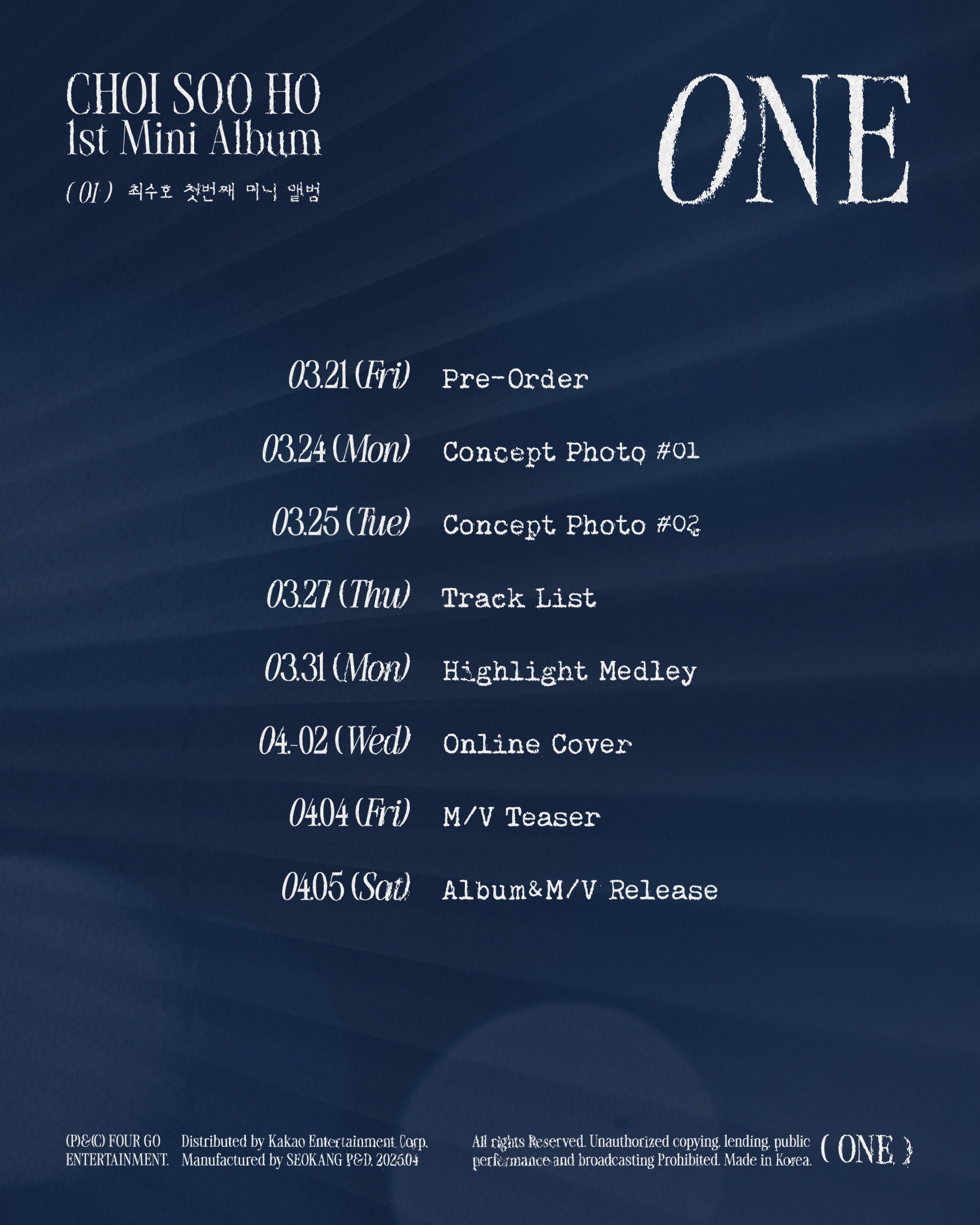 포고엔터테인먼트는 20일 공식 홈페이지에 최수호의 첫 번째 미니앨범 '원'(ONE) 스케줄러를 공개했다. 컴백 카운트다운에 돌입했다.