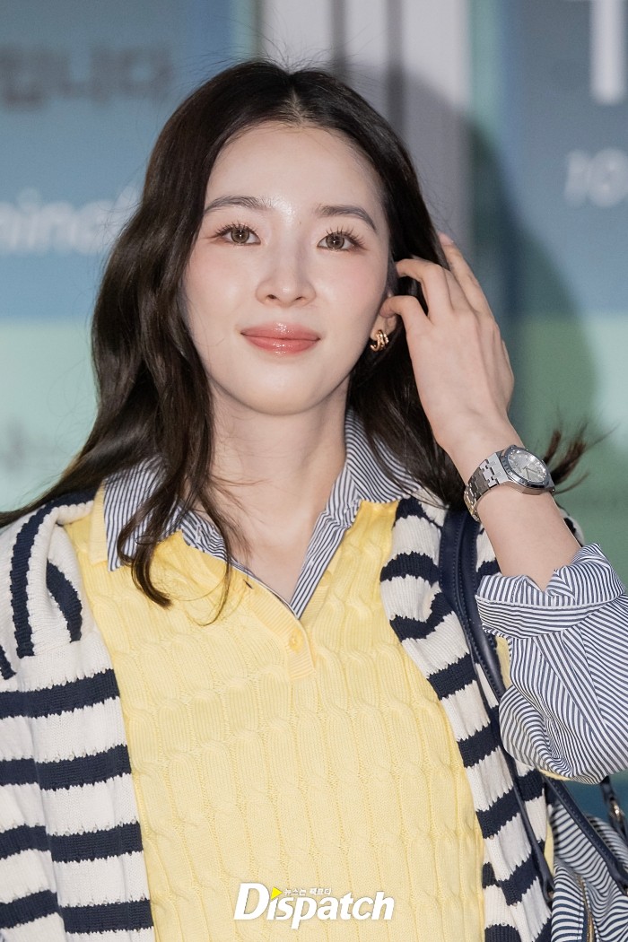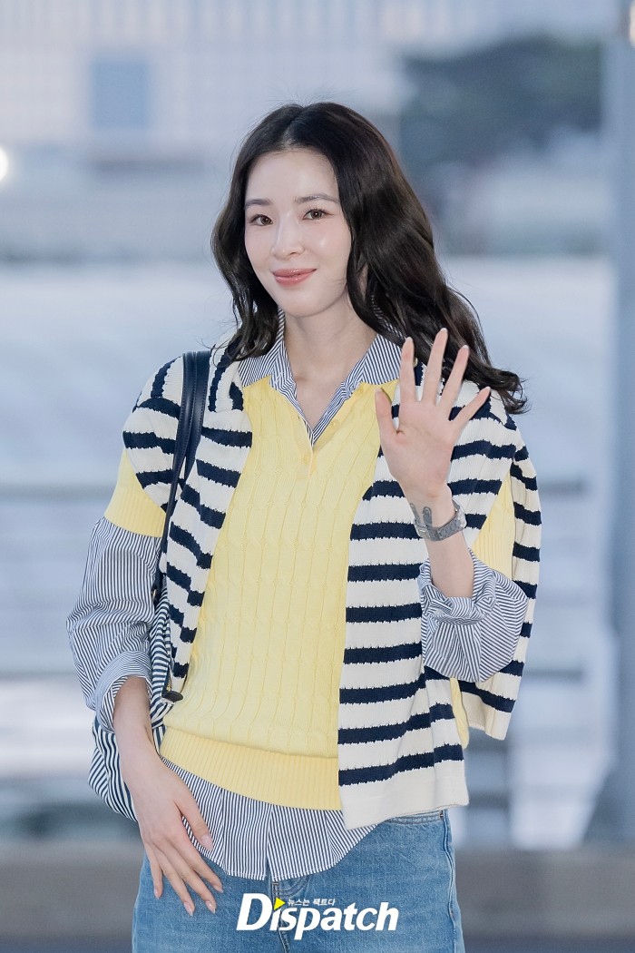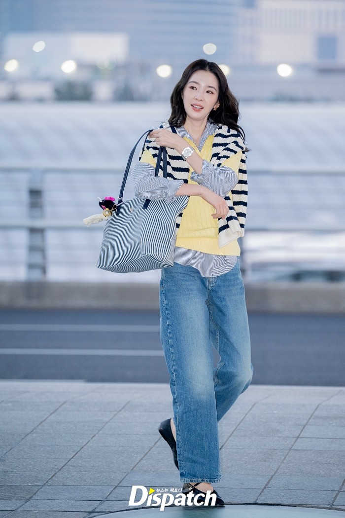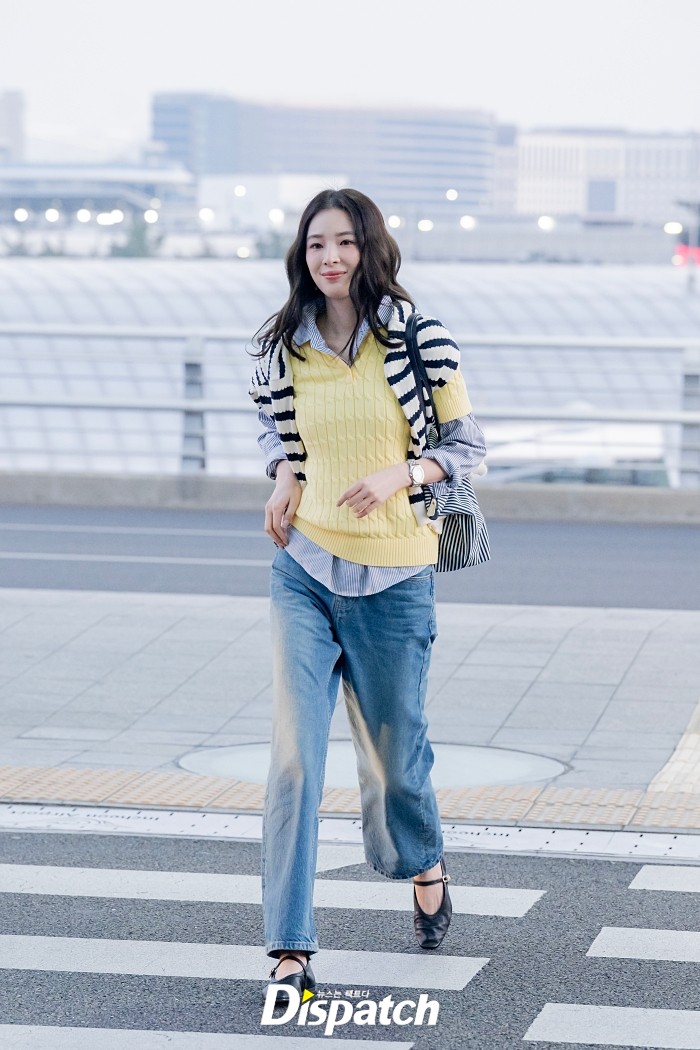 아이린은 스트라이프 패턴의 셔츠와 케이블 폴로 니트를 레이어드했다. 산뜻한 분위기가 돋보였다.