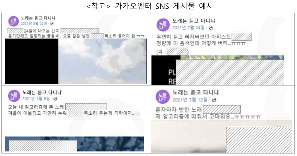 '아이돌연구소'(페이스북), '노래는듣고다니냐'(페이스북·유튜브·인스타그램·틱톡) 등이 그 대표적인 사례. 지난 2016년 10월~2024년 2월까지, 2,353건 게시물을 올렸다.