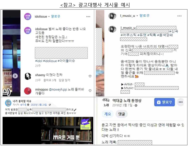 세 번째, 광고대행사에 경제적 대가를 지급하고 SNS를 통해 음원·음반을 광고하도록 했다. 역시 경제적 이해관계를 명확히 하지 않아, 소비자가 광고임을 인지할 수 없도록 했다.