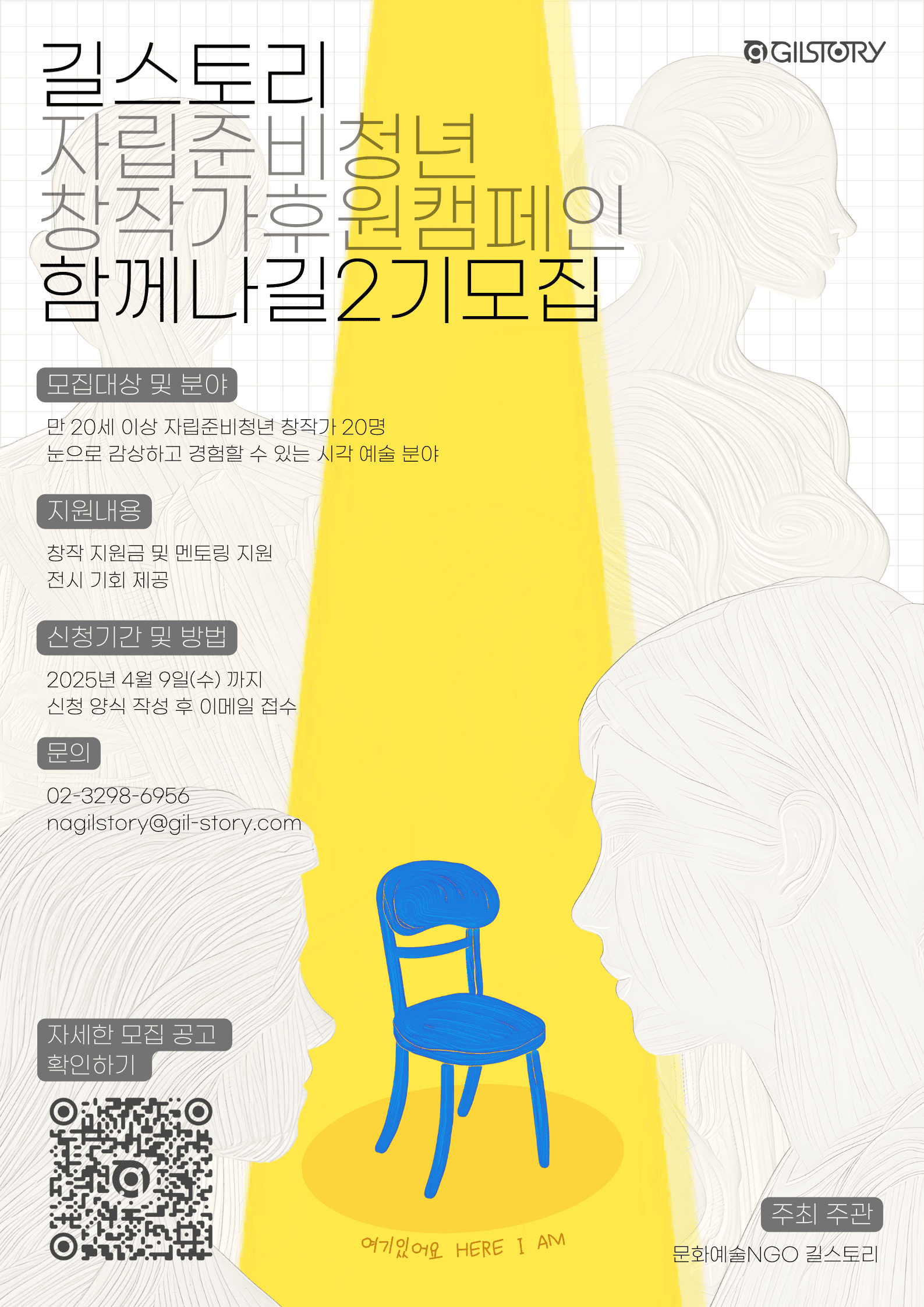 문화예술NGO '길스토리'는 25일 "자립준비청년 창작가 후원 캠페인 '함께나길'을 진행한다. 오는 4월 9일까지 2기를 모집한다"고 밝혔다.