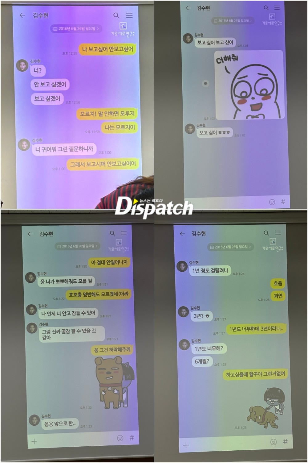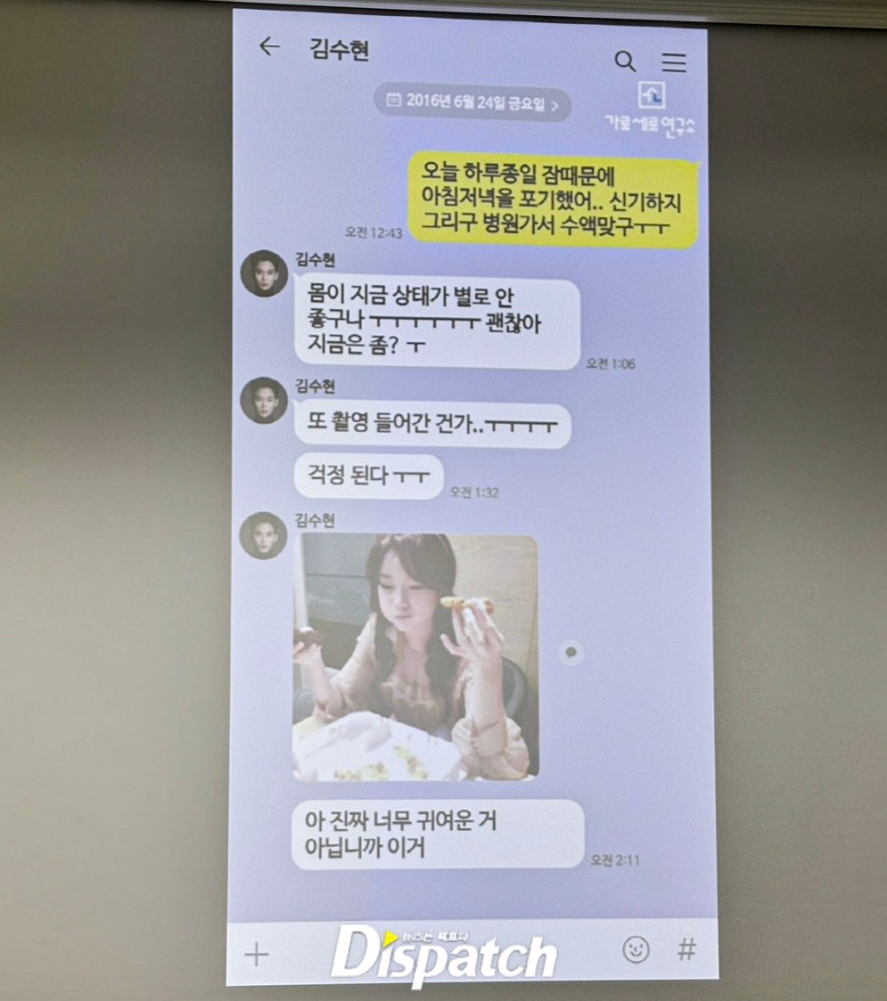 이날 현장에서 김새론과 김수현이 나눈 카카오톡 메시지 6장을 공개했다. 2016년 6월 24~26일까지 대화다. 부 변호사는 김새론이 미성년자 시절 김수현과 교제했던 증거라고 주장했다.