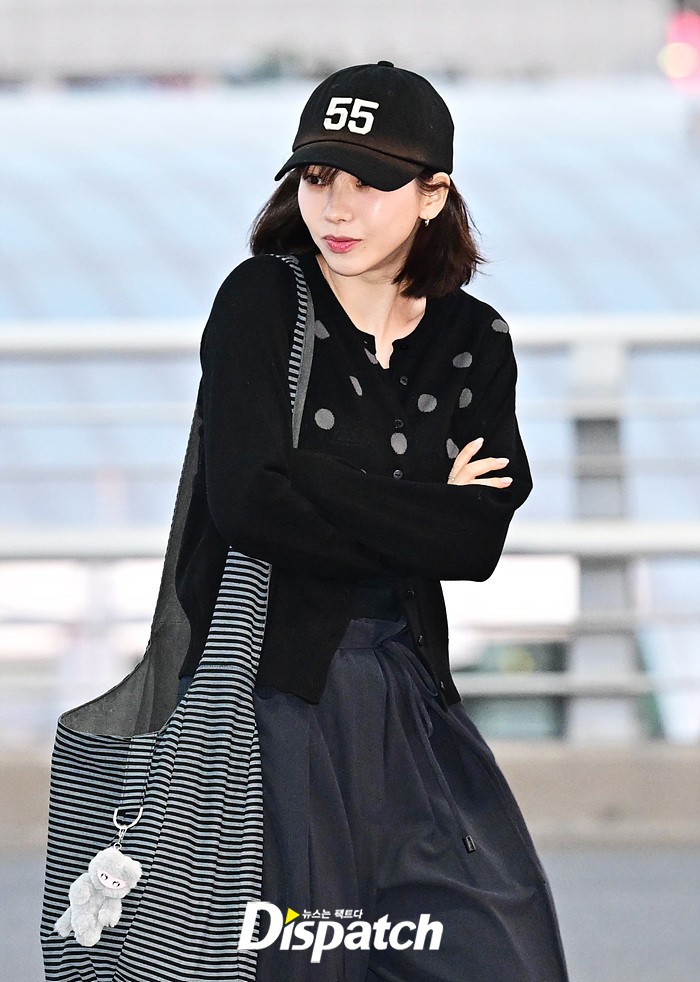 카리나는 볼캡과 가디건, 와이드 팬츠로 캐주얼한 공항패션을 연출했다. 내추럴한 비주얼로 취재진의 시선을 사로 잡았다.