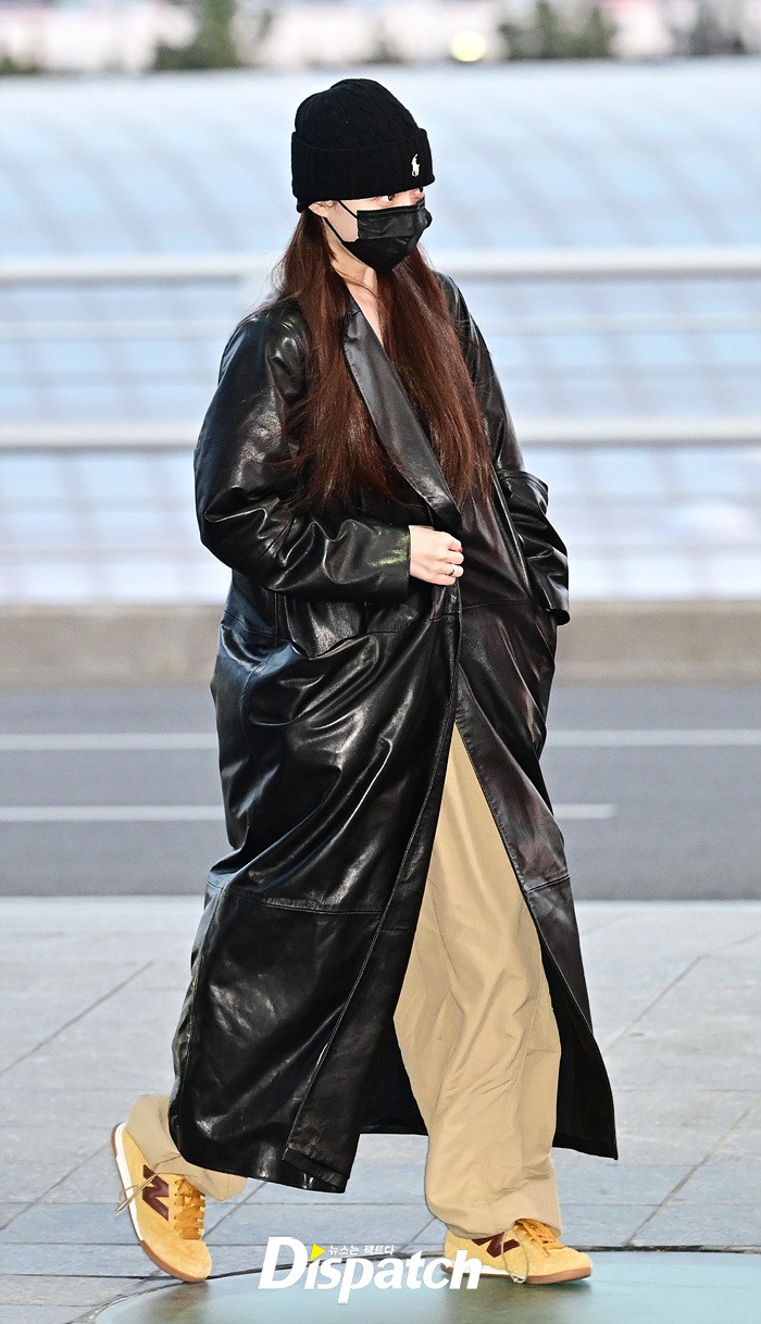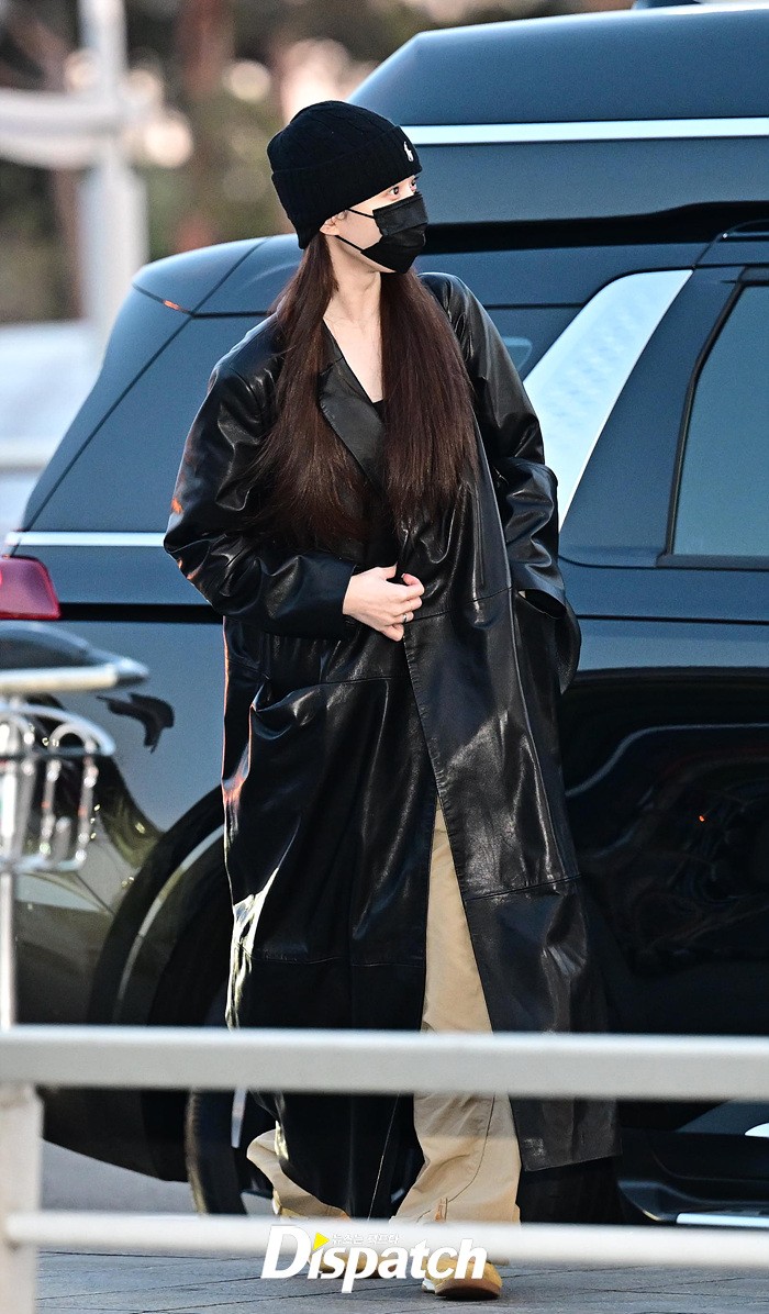 윈터는 비니와 마스크, 가죽 롱코트로 시크한 공항패션을 연출했다. 마스크에도 또렷한 눈망울이 인상적이였다.