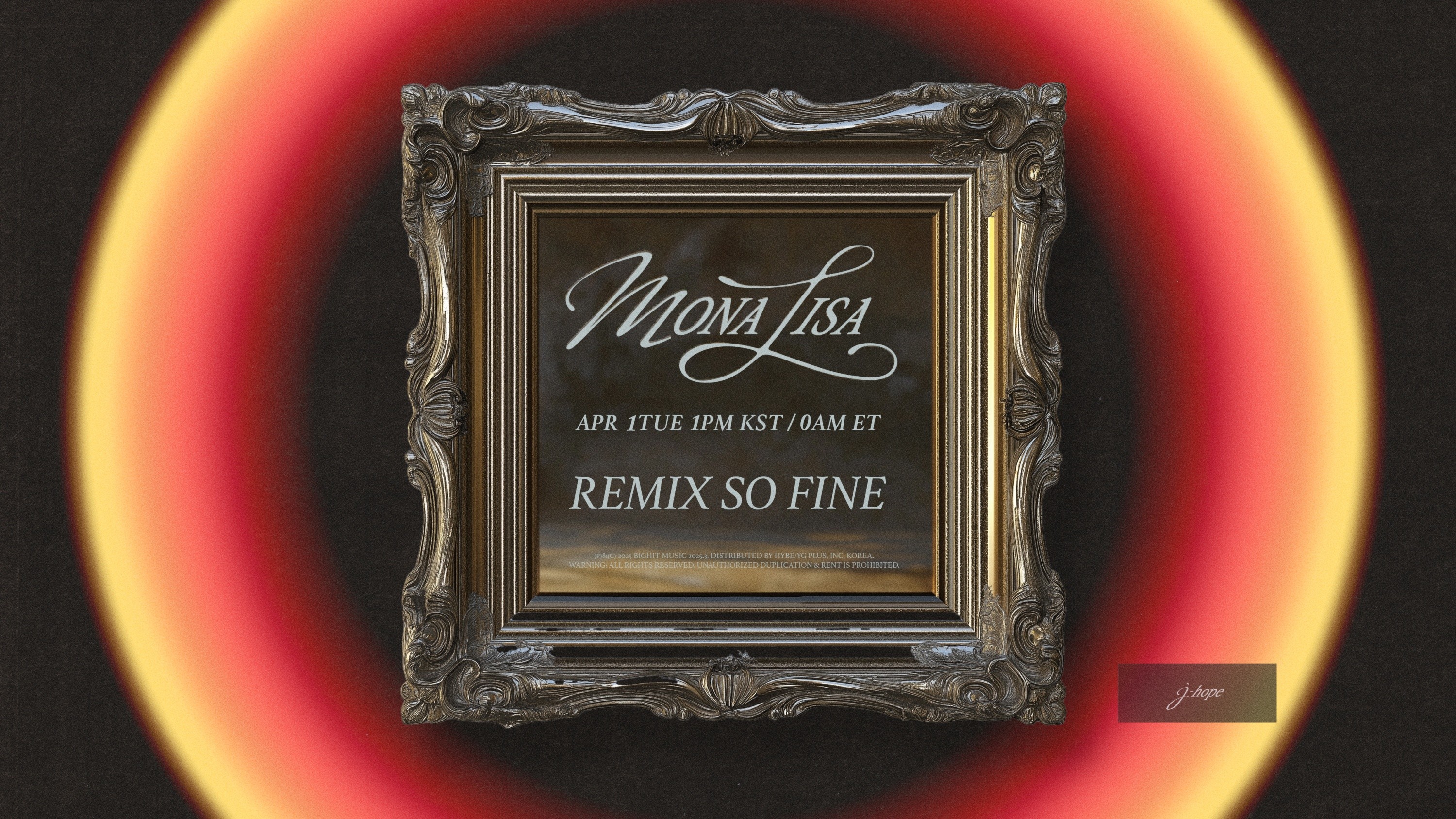 빅히트 뮤직은 31일 "제이홉이 4월 1일 오후 1시(한국시간) 리믹스 앨범 '모나리자-리믹스 소 파인'(MONA LISA-Remix so fine)을 발매한다"고 밝혔다.