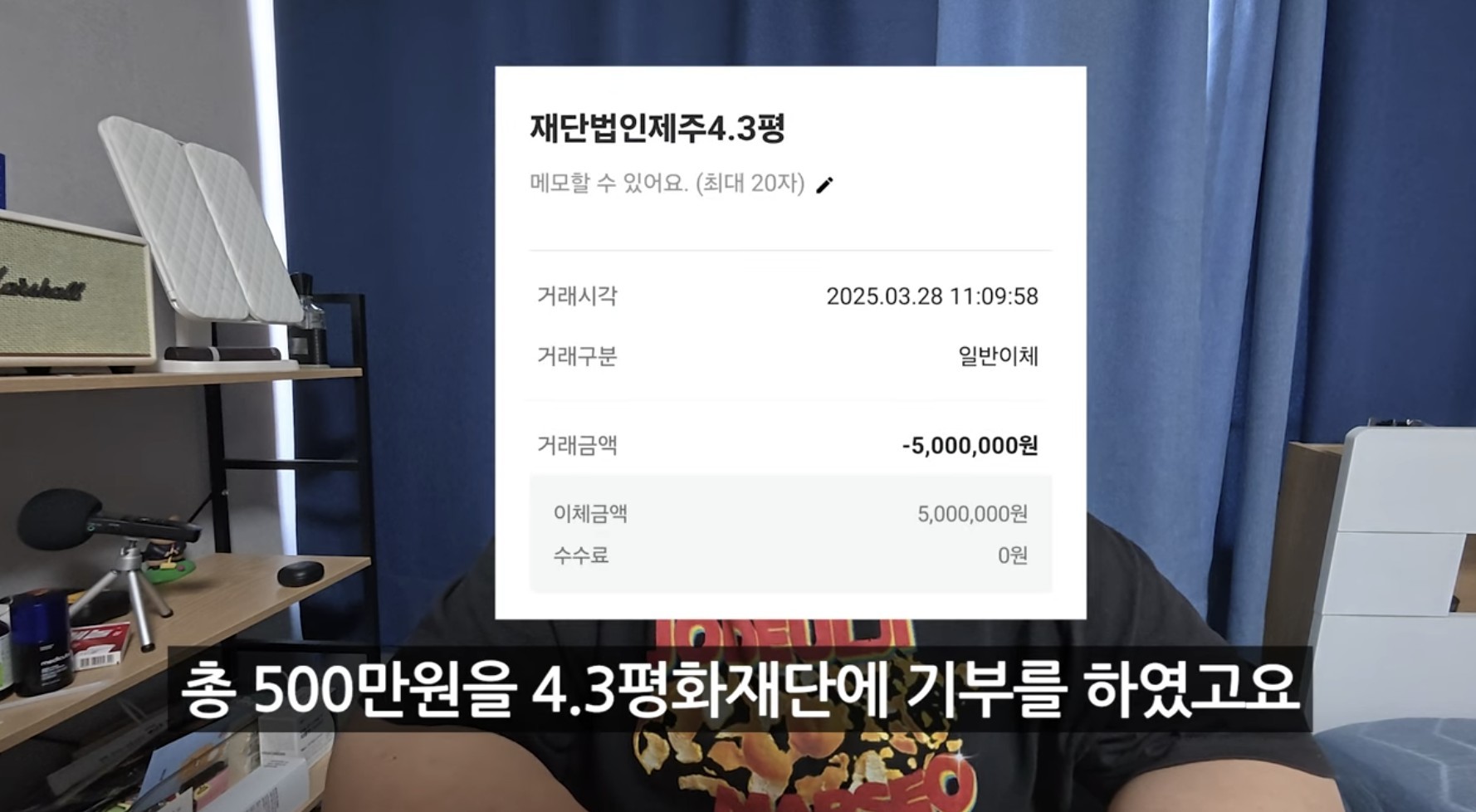 그는 "'폭싹 속았수다' 리뷰 영상으로만 343만 원을 번 것"이라며 "어떻게 쓸까 고민 많이 했는데 4월 3일이 제주 4·3 (희생자 추념일)"이라 했다.