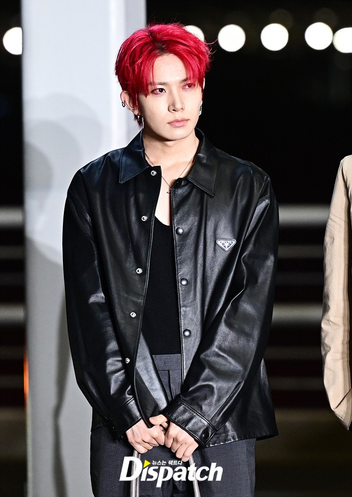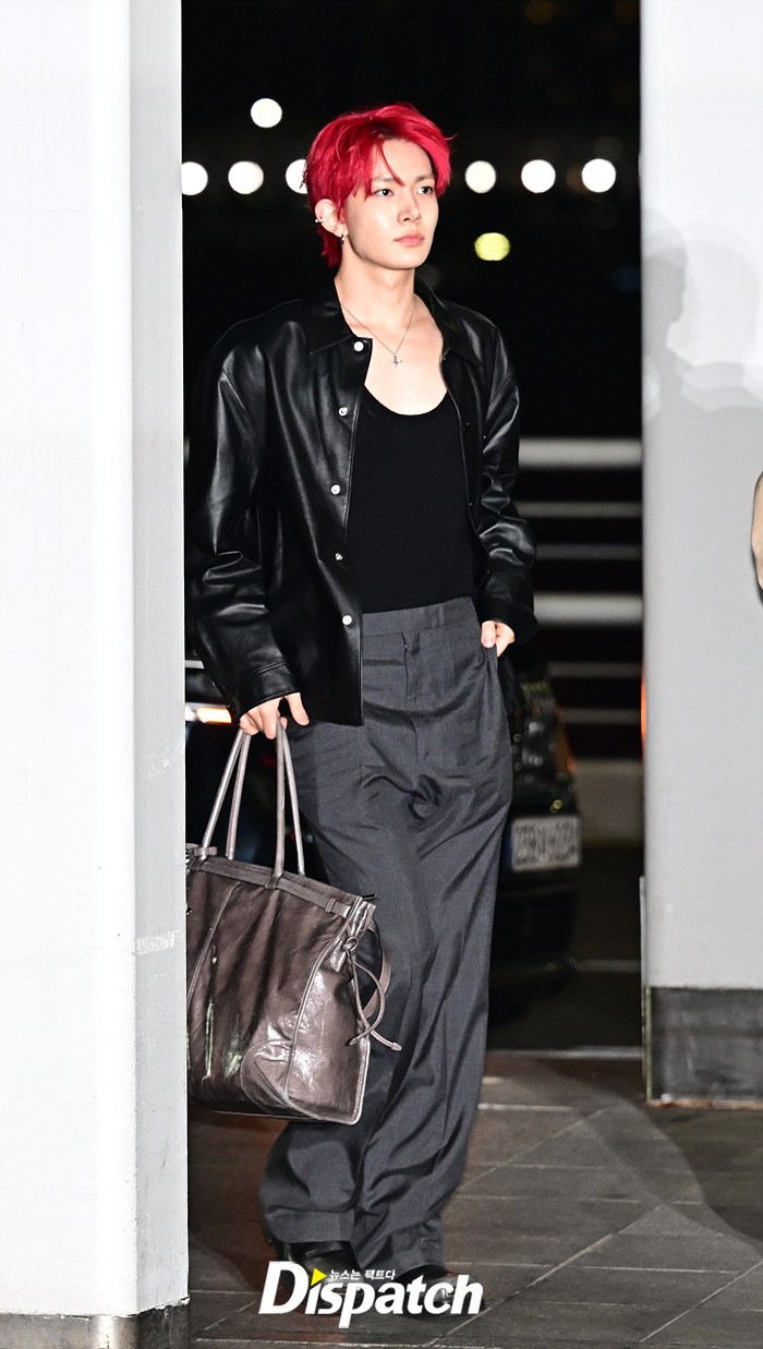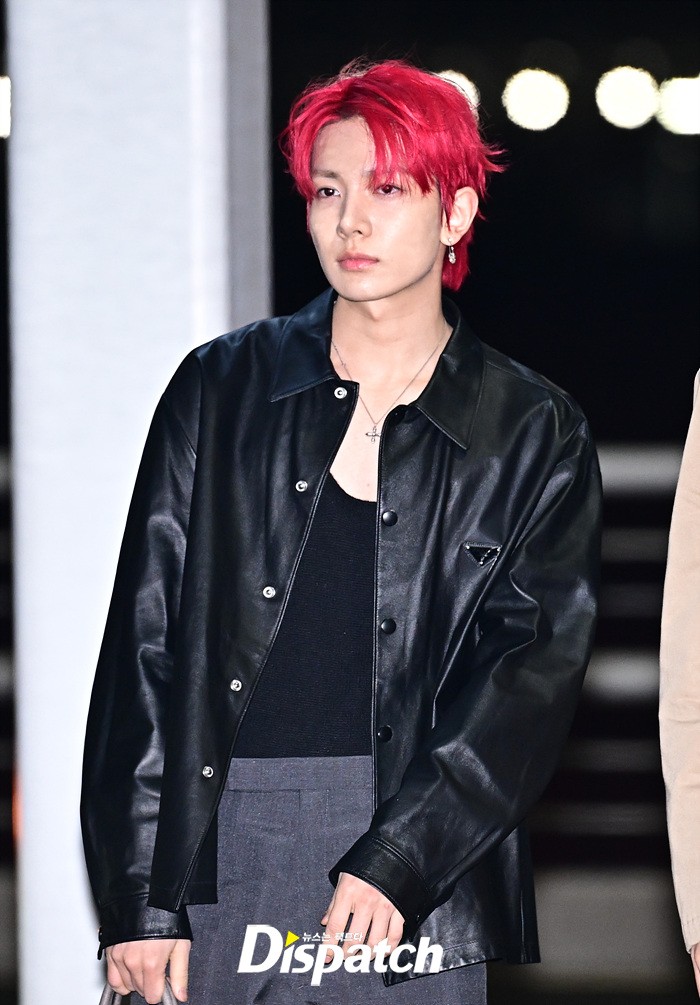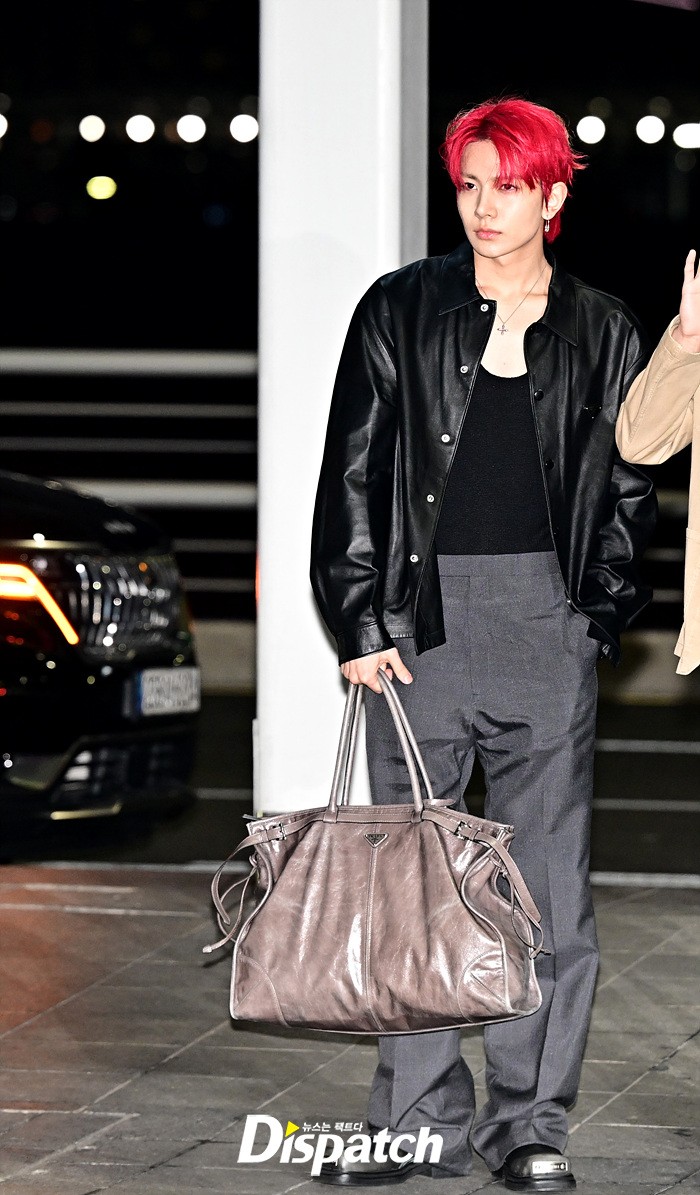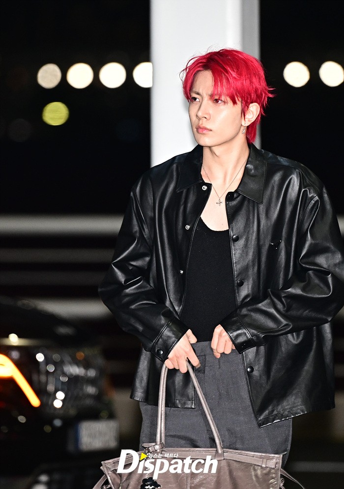 희승은 강렬한 레드헤어로 눈길을 끌었다. 가죽재킷으로 연출한 시크한 공항패션도 돋보였다.
