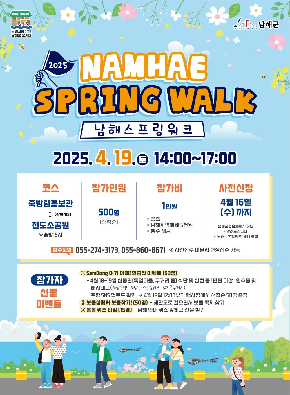 '남해 스프링 워크'는 죽방렴홍보관에서 전도 소공원까지 왕복 4km에 펼쳐진다. 국가중요어업유산인 죽방렴 등을 볼 수 있다.