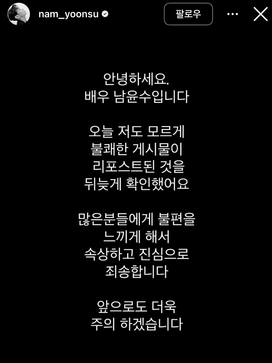 혼란스러운 해명에 논란은 더욱 커졌다. 남윤수는 결국 사과문을 올렸다. "오늘 저도 모르게 불쾌한 게시물이 리포스트된 것을 뒤늦게 확인했다"고 말문을 열었다.