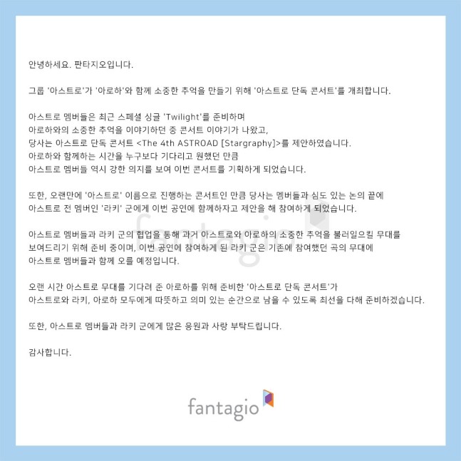 판타지오는 14일 공식 SNS에 "아스트로가 아로하(팬덤명)과 소중한 추억을 만들기 위해 단독 콘서트를 개최한다. 전 멤버 라키도 참여한다"고 밝혔다.