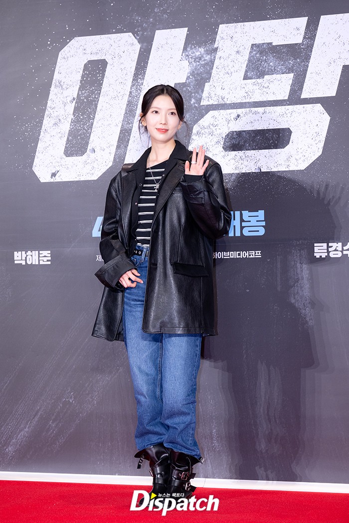 하서윤은 데님 팬츠에 레더 재킷으로 시크한 패션을 연출했다. 우아한 미모가 돋보였다.