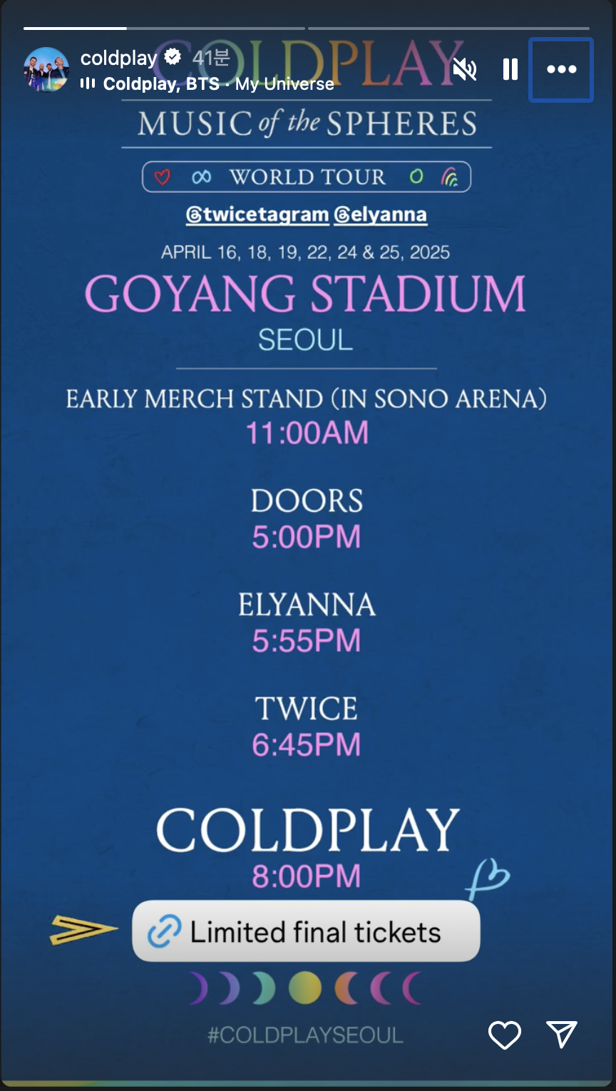 콜드플레이는 16일 경기 고양시 고양종합운동장에서 내한 공연 '뮤직 오브 더 스피어스 월드투어'를 개최한다. 트와이스가 스페셜 게스트로 나선다.