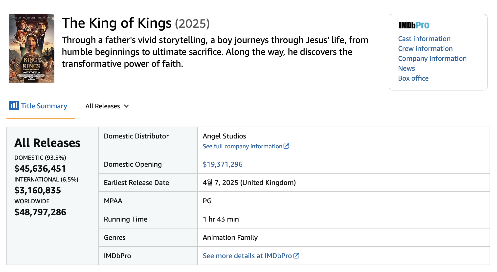 북미 박스오피스 사이트 모조에 따르면 '킹 오브 킹스'는 21일 글로벌 박스오피스 누적 약 4,879만 달러(한화 약 668억 원)를 달성했다.