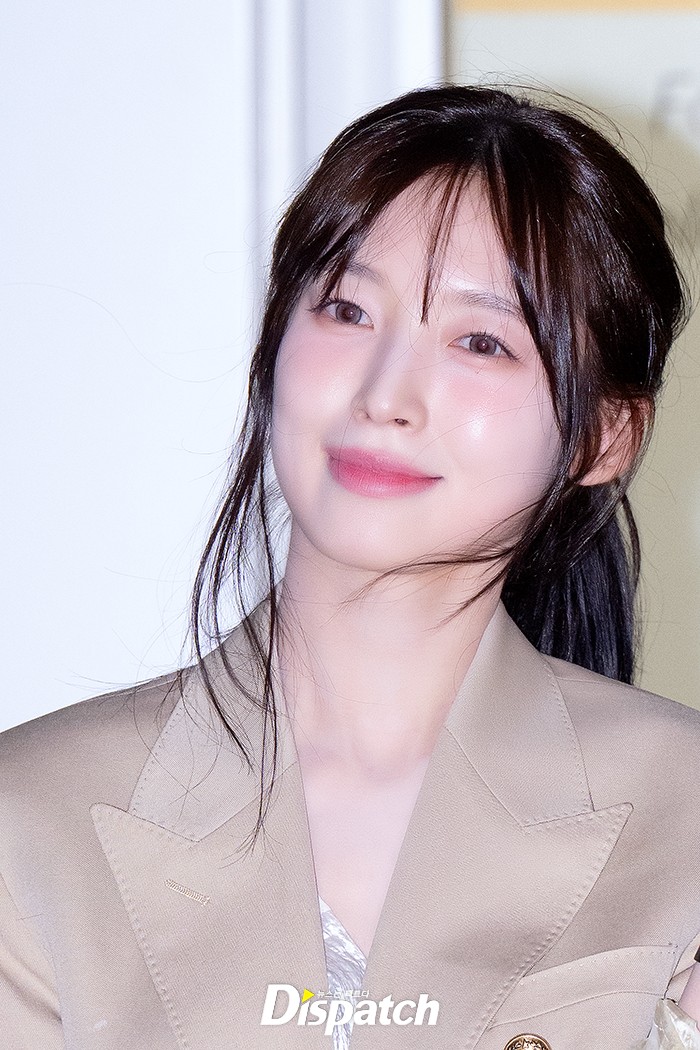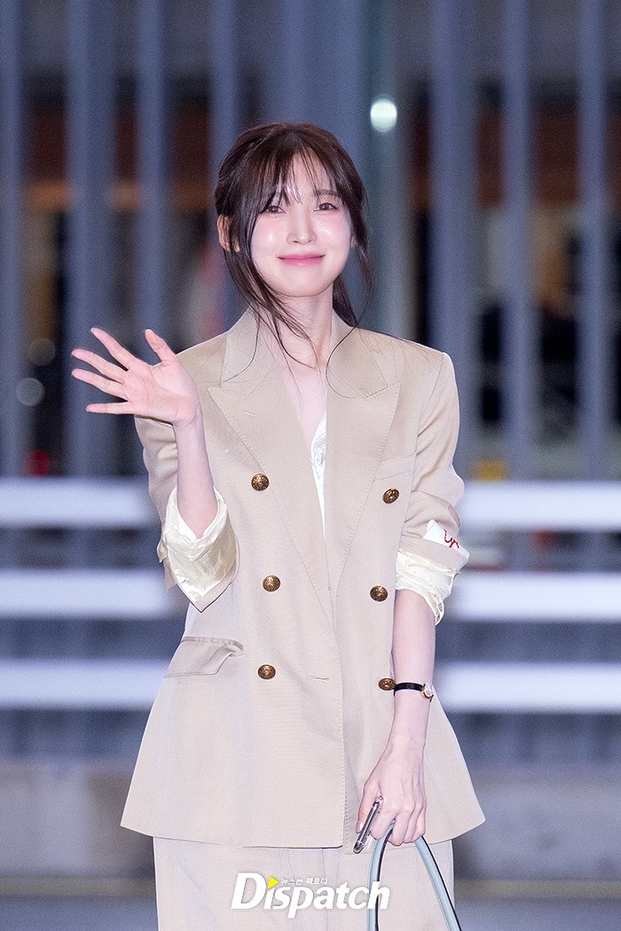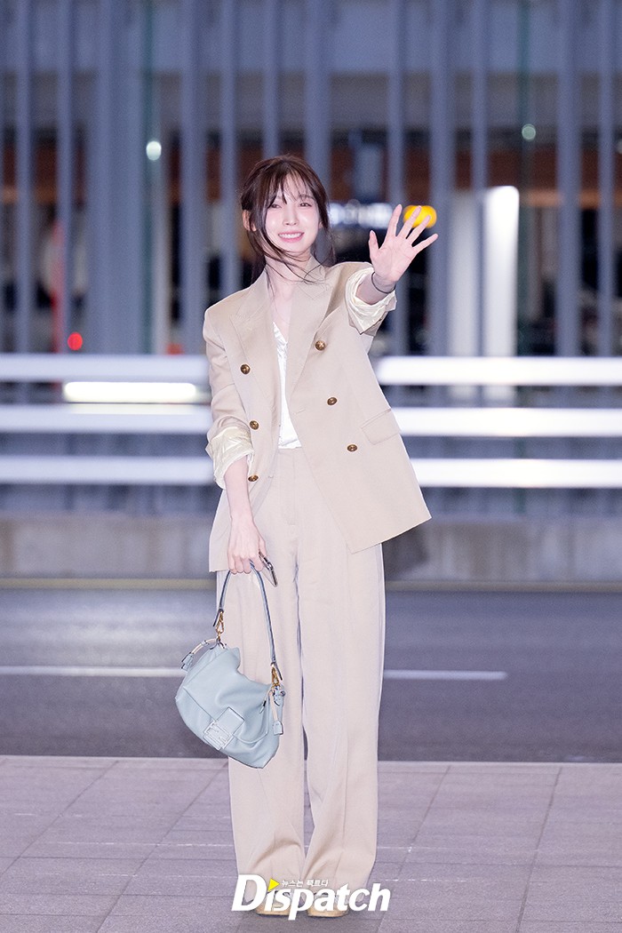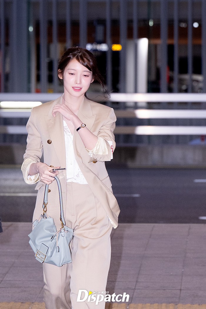 아린은 베이지 수트로 우아한 공항패션을 연출했다. 인형같은 미모가 돋보였다.