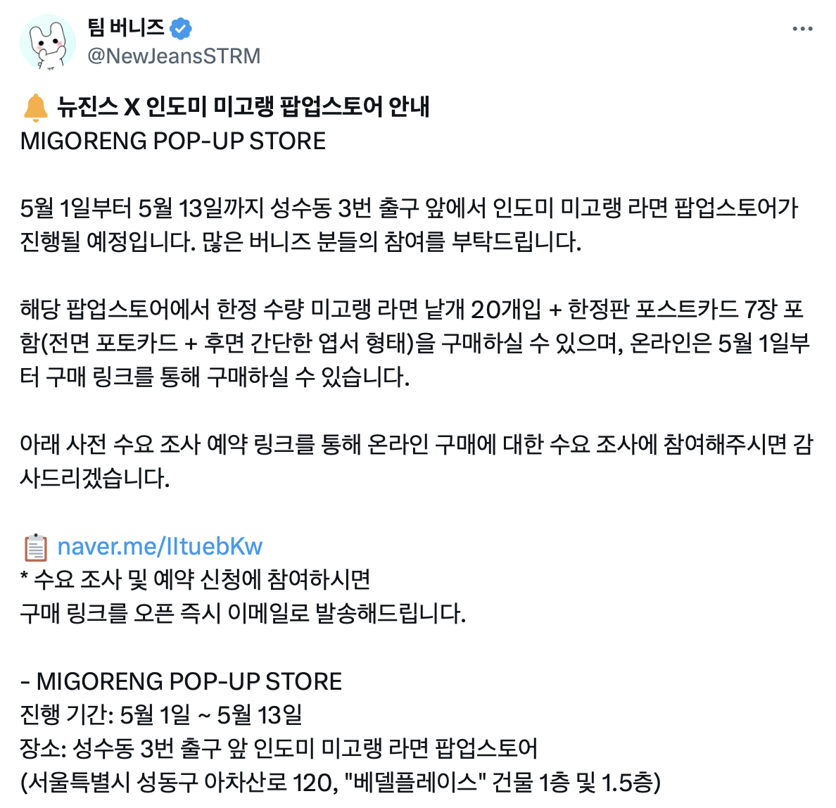 문제가 된 건, 뉴진스 팬덤 대표를 자처하고 있는 팀 버니즈의 행보다. 이들은 지난 25일 SNS에 뉴진스와 인도미 미고랭 팝업스토어 안내문을 올렸다.