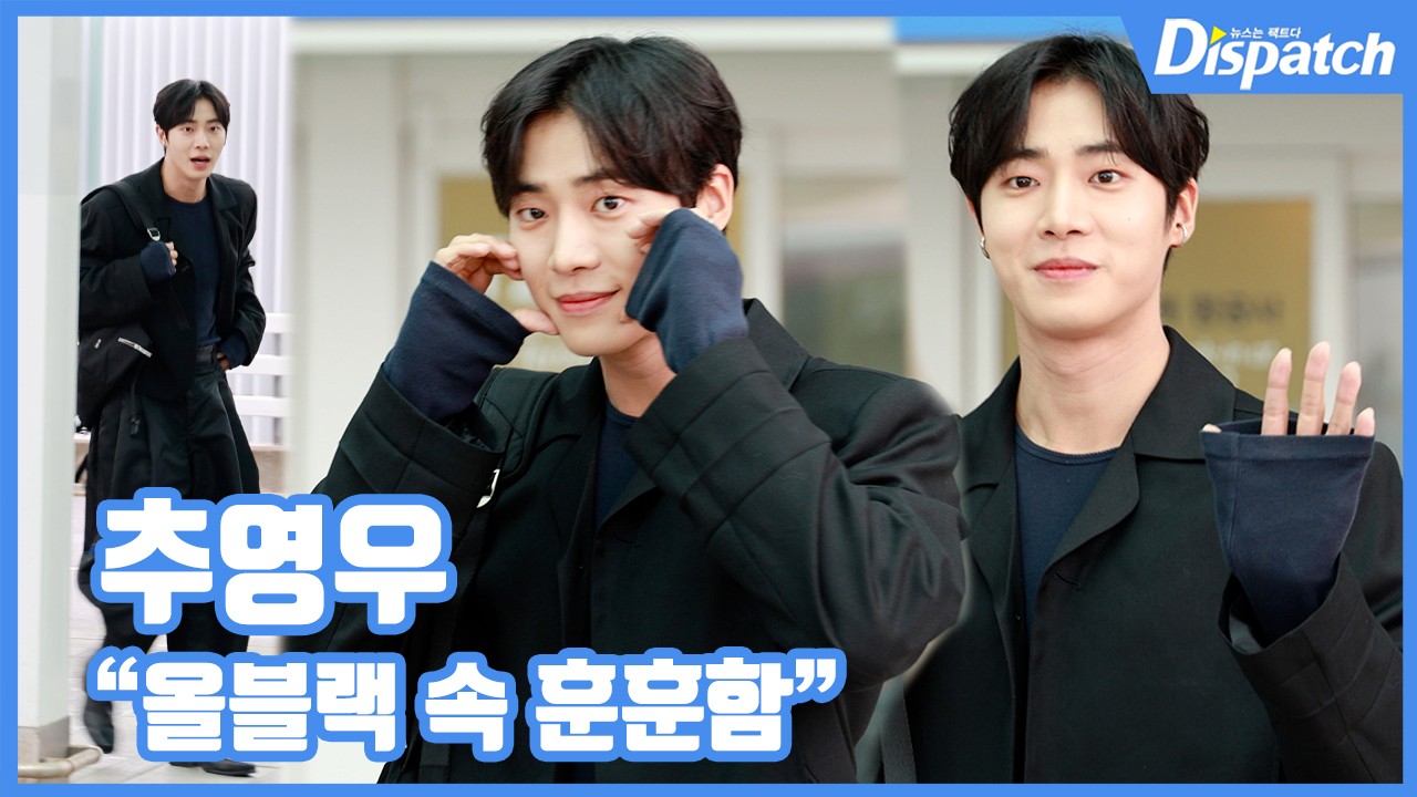 이날 추영우는 올블랙 공항패션을 선보여 시크한 매력을 뽐내는 동시에 미소와 손하트 포즈로 사랑스러운 면모를 보여줬다.