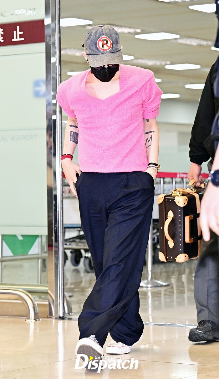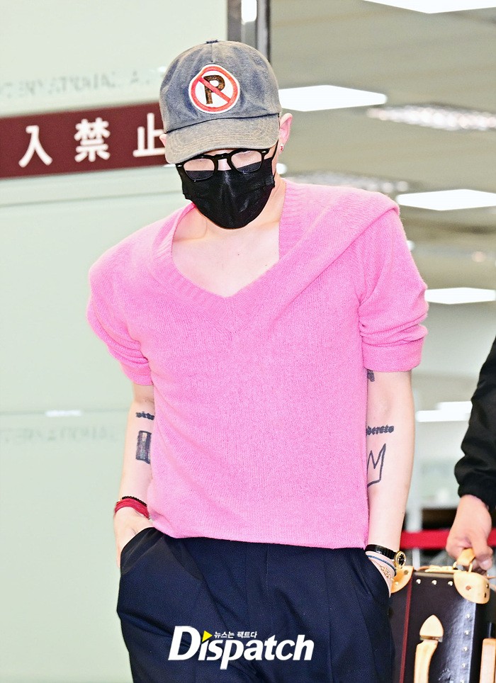 지드래곤은 핑크색 스웨터와 블랙 와이드진으로 센스있는 스타일링을 완성했다. 모자와 마스크에도 강렬한 카리스마가 돋보였다.